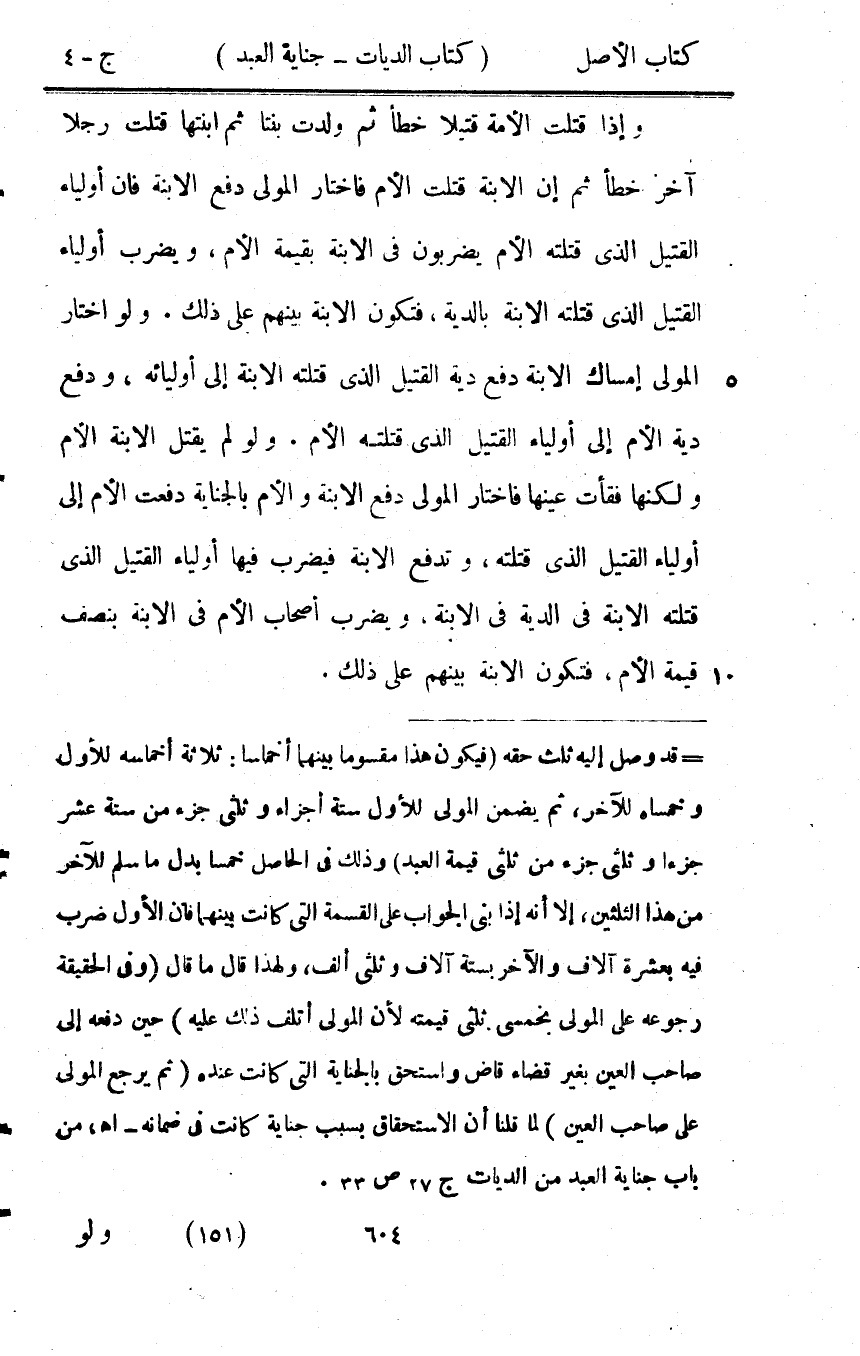 وَإِذا قتلت الْأمة قَتِيلا خطأ ثمَّ ولدت بِنْتا ثمَّ ابْنَتهَا قتلت رجلا آخر خطأ ثمَّ إِن الِابْنَة قتلت الْأُم فَاخْتَارَ الْمولى دفع الِابْنَة فان أَوْلِيَاء الْقَتِيل الَّذِي قتلته الْأُم يضْربُونَ فِي الِابْنَة بِقِيمَة الْأُم وَيضْرب أَوْلِيَاء الْقَتِيل الَّذِي قتلته الِابْنَة بِالدِّيَةِ فَتكون الِابْنَة بَينهم على ذَلِك وَلَو اخْتَار الْمولى إمْسَاك الِابْنَة دفع دِيَة الْقَتِيل الَّذِي قتلته الِابْنَة إِلَى أوليائه وَدفع دِيَة الْأُم إِلَى أَوْلِيَاء الْقَتِيل الَّذِي قتلته الْأُم وَلَو لم يقتل الِابْنَة الْأُم وَلكنهَا فقأت عينهَا فَاخْتَارَ الْمولى دفع الِابْنَة وَالأُم بِالْجِنَايَةِ دفعت الْأُم إِلَى أَوْلِيَاء الْقَتِيل الَّذِي قتلته وتدفع الِابْنَة فَيضْرب فِيهَا أَوْلِيَاء الْقَتِيل الَّذِي قتلته الِابْنَة فِي الدِّيَة فِي الِابْنَة وَيضْرب أَصْحَاب الْأُم فِي الِابْنَة بِنصْف قيمَة الْأُم فَتكون الِابْنَة بَينهم على ذَلِك