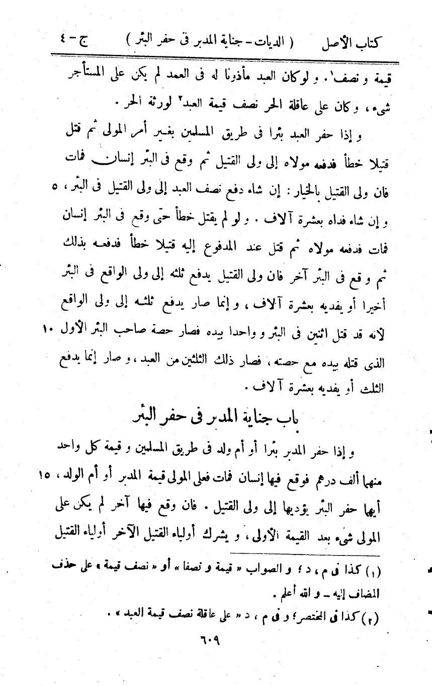 - وَإِذا حفر الْمُدبر بِئْرا أَو أم ولد فِي طَرِيق الْمُسلمين وَقِيمَة كل وَاحِد مِنْهُمَا ألف دِرْهَم فَوَقع فِيهَا إِنْسَان فَمَاتَ فعلى الْمولى قيمَة الْمُدبر أَو أم الْوَلَد أَيهمَا حفر الْبِئْر يُؤَدِّيهَا إِلَى ولي الْقَتِيل فان وَقع فِيهَا آخر لم يكن على الْمولى شَيْء بعد الْقيمَة الأولى ويشرك أَوْلِيَاء الْقَتِيل الآخر أَوْلِيَاء الْقَتِيل
