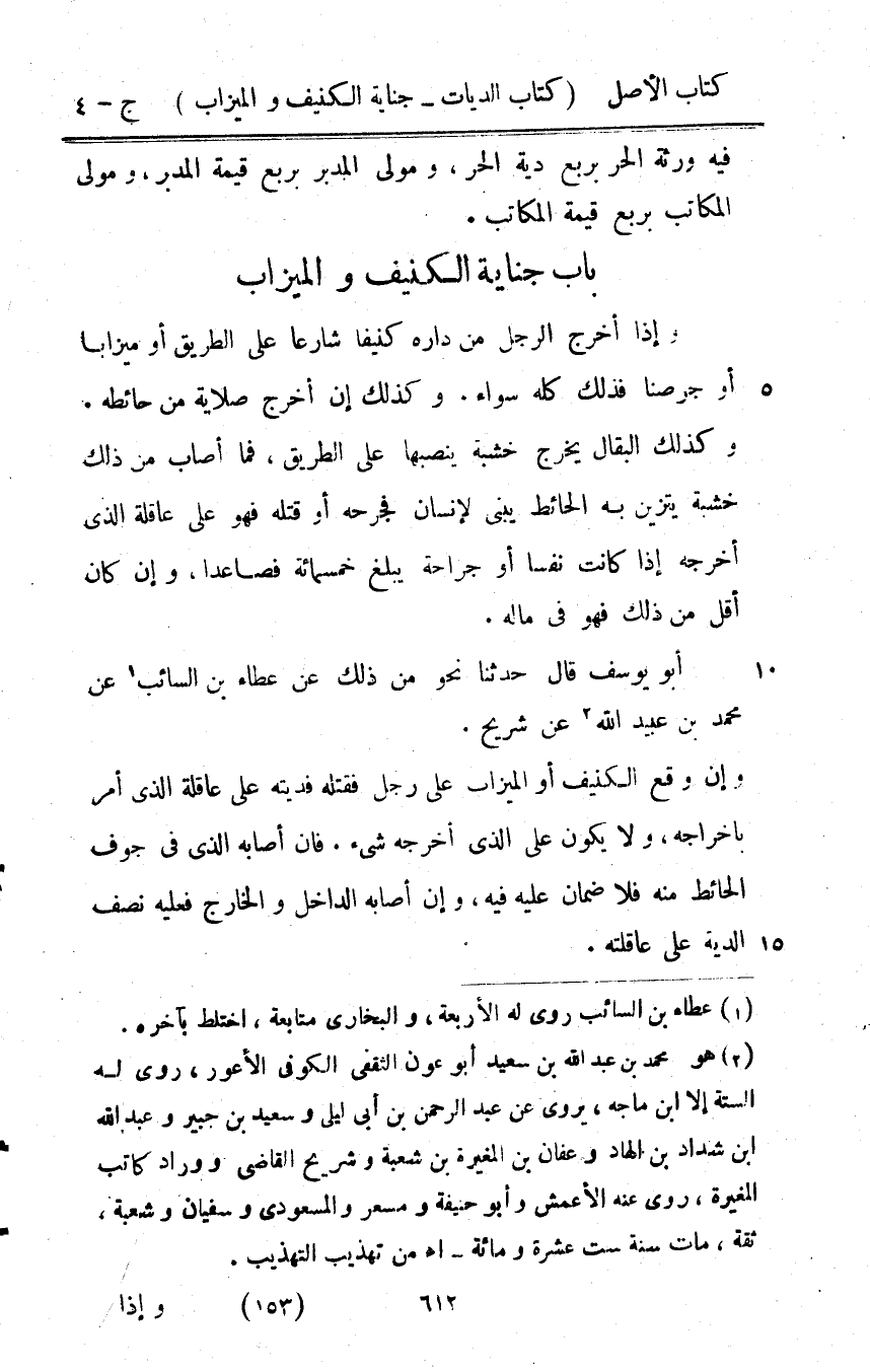 - وَإِذا أخرج الرجل من دَاره كنيفا شَارِعا على الطَّرِيق أَو ميزابا أَو جرصنا فَذَلِك كُله سَوَاء وَكَذَلِكَ إِن أخرج صلاية من حَائِطه وَكَذَلِكَ الْبَقَّال يخرج خَشَبَة ينصبها على الطَّرِيق فَمَا أصَاب من ذَلِك حشية يتزين بِهِ الْحَائِط يبْنى لإِنْسَان فجرحه أَو قَتله فَهُوَ على عَاقِلَة الَّذِي أخرجه إِذا كَانَت نفسا أَو جِرَاحَة يبلغ خَمْسمِائَة فَصَاعِدا وَإِن كَانَ أقل من ذَلِك فَهُوَ فِي مَاله أَبُو يُوسُف قَالَ حَدثنَا نَحْو من ذَلِك عَطاء بن السَّائِب عَن مُحَمَّد بن عبيد الله عَن شُرَيْح وَإِن وَقع الكنيف أَو الْمِيزَاب على رجل فَقتله فديته على عَاقِلَة الَّذِي أَمر باخراجه وَلَا يكون على الَّذِي أخرجه شَيْء فان أَصَابَهُ الَّذِي فِي جَوف الْحَائِط مِنْهُ فَلَا ضَمَان عَلَيْهِ فِيهِ وَإِن اصابه الدَّاخِل وَالْخَارِج فَعَلَيهِ نصف الدِّيَة على عَاقِلَته