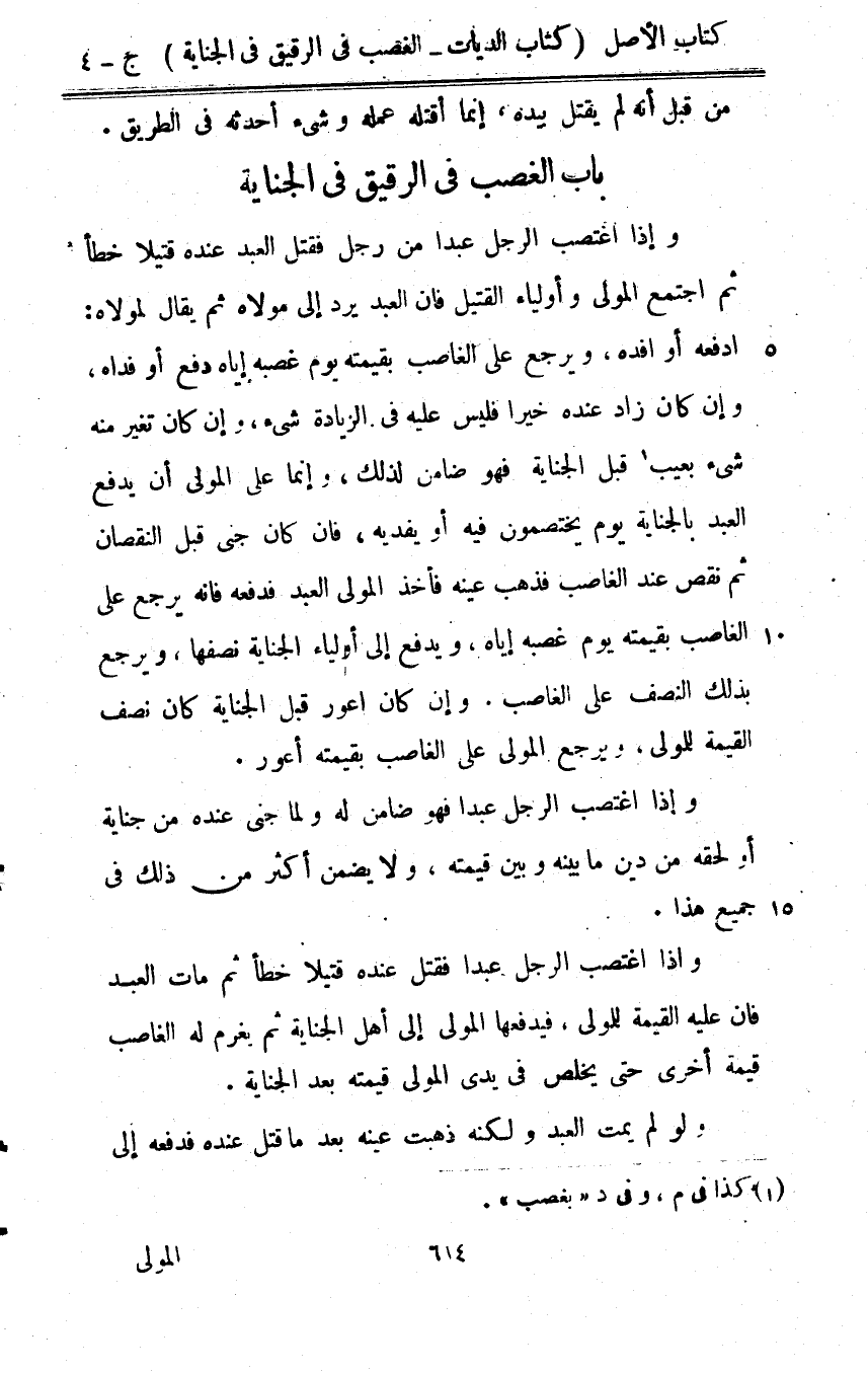- وَإِذا اغتصب الرجل عبدا من رجل فَقتل العَبْد عِنْده قَتِيلا خطأ ثمَّ اجْتمع الْمولى وأولياء الْقَتِيل فان العَبْد يرد إِلَى مَوْلَاهُ ثمَّ يُقَال لمَوْلَاهُ ادفعه أَو افده وَيرجع على الْغَاصِب بِقِيمَتِه يَوْم غصبه إِيَّاه دفع أَو فدَاه وَإِن كَانَ زَاد عِنْده خيرا فَلَيْسَ عَلَيْهِ فِي الزِّيَادَة شَيْء وَإِن كَانَ تغير مِنْهُ شَيْء بِعَيْب قبل الْجِنَايَة فَهُوَ ضَامِن لذَلِك وَإِنَّمَا على الْمولى أَن يدْفع العَبْد بِالْجِنَايَةِ يَوْم يختصمون فِيهِ أَو يفْدِيه فان كَانَ جنى قبل النُّقْصَان ثمَّ نقص عِنْد الْغَاصِب فَذهب عينه فَأخذ الْمولى العَبْد فَدفعهُ فانه يرجع على الْغَاصِب بِقِيمَتِه يَوْم غصبه إِيَّاه وَيدْفَع إِلَى أَوْلِيَاء الْجِنَايَة نصفهَا وَيرجع بذلك النّصْف على الْغَاصِب وَإِن كَانَ اعور قبل الْجِنَايَة كَانَ نصف الْقيمَة للْمولى وَيرجع الْمولى على الْغَاصِب بِقِيمَتِه أَعور