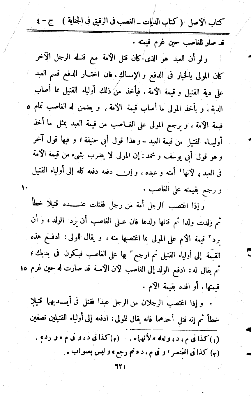 وَإِذا اغتصب الرجل أمة من رجل فقتلت عِنْده قَتِيلا خطأ ثمَّ ولدت ولدا ثمَّ قَتلهَا وَلَدهَا فان على الْغَاصِب أَن يرد الْوَلَد وَأَن يرد قيمَة الْأُم على الْمولى بِمَا اغتصبها مِنْهُ وَيُقَال للْمولى ادْفَعْ هَذِه الْقيمَة إِلَى أَوْلِيَاء الْقَتِيل ثمَّ ارْجع بهَا على الْغَاصِب فَيكون فِي يَديك ثمَّ يُقَال لَهُ ادْفَعْ الْوَلَد إِلَى الْغَاصِب لِأَن الْأمة قد صَارَت لَهُ حِين غرم قيمتهَا أَو افده بِقِيمَة الْأُم وَإِذا اغتصب الرّجلَانِ من الرِّجَال عبدا فَقتل فِي أَيْدِيهِمَا قَتِيلا خطأ ثمَّ إِنَّه قتل أَحدهمَا فانه يُقَال للْمولى ادفعه إِلَى أَوْلِيَاء الْقَتِيلين نِصْفَيْنِ