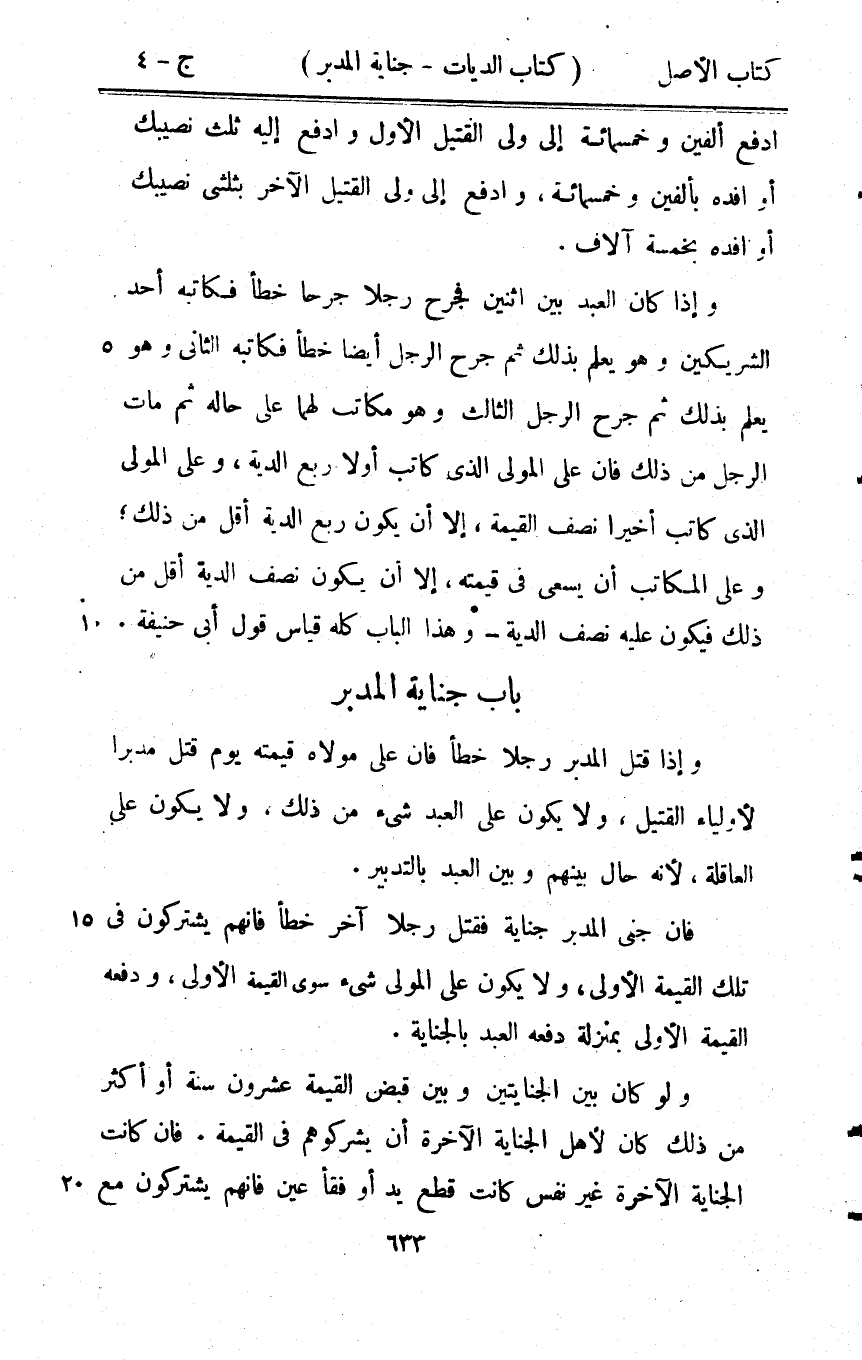 - وَإِذا قتل الْمُدبر رجلا خطأ فان على مَوْلَاهُ قِيمَته يَوْم قتل مُدبرا لأولياء الْقَتِيل وَلَا يكون على العَبْد شَيْء من ذَلِك وَلَا يكون على الْعَاقِلَة لِأَنَّهُ حَال بَينهم وَبَين العَبْد بِالتَّدْبِيرِ فان جنى الْمُدبر جِنَايَة فَقتل رجلا آخر خطأ فانهم يشتركون فِي تِلْكَ الْقيمَة الأولى لَا يكون على الْمولى شَيْء سوى الْقيمَة الأولى وَدفعه الْقيمَة الأولى بِمَنْزِلَة دَفعه العَبْد بِالْجِنَايَةِ وَلَو كَانَ بَين الجنايتين وَبَين قبض الْقيمَة عشرُون سنة أَو أَكثر من ذَلِك كَانَ لأهل الْجِنَايَة الْآخِرَة أَن يشركوهم فِي الْقيمَة فان كَانَت الْجِنَايَة الْآخِرَة غير نفس كَانَت قطع يَد أَو فَقَأَ عين فانهم يشتركون مَعَ