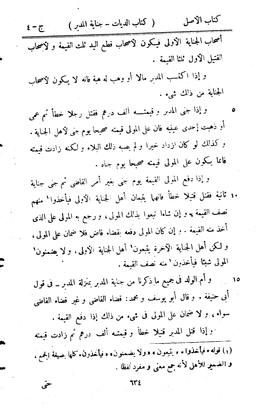 وَإِذا جنى الْمُدبر وَقِيمَته الف دِرْهَم فَقتل رجلا خطأ ثمَّ عمى أَو ذهبت إِحْدَى عَيْنَيْهِ فان على الْمولى قِيمَته صَحِيحا يَوْم جنى لأهل الْجِنَايَة وَكَذَلِكَ لَو كَانَ ازْدَادَ خيرا وَلم يصبهُ ذَلِك الْبلَاء وَلكنه زَادَت قِيمَته فانما يكون على الْمولى قِيمَته صَحِيحا يَوْم جناه وَإِذا دفع الْمولى الْقيمَة يَوْم جنى بِغَيْر أَمر القَاضِي ثمَّ جنى جِنَايَة ثَانِيَة فَقتل قَتِيلا خطأ فانهما يتبعان أهل الْجِنَايَة الأولى فيأخذوا مِنْهُم نصف الْقيمَة وَإِن شاءا تبعوا بذلك الْمولى وَرجع بِهِ الْمولى على الَّذِي أَخذ مِنْهُ الْقيمَة وَإِن كَانَ الْمولى دَفعه بِقَضَاء قَاض فَلَا ضَمَان على الْمولى وَلَكِن أهل الْجِنَايَة الْآخِرَة يتبعُون أهل الْجِنَايَة الأولى وَلَا يضمنُون الْمولى شَيْئا فَيَأْخُذُونَ مِنْهُ نصف الْقيمَة وَأم الْوَلَد فِي جيمع مَا ذكرنَا من جِنَايَة الْمُدبر بِمَنْزِلَة الْمُدبر فِي قَول أبي حنيفَة وَقَالَ أَبُو يُوسُف وَمُحَمّد قَضَاء القَاضِي وَغير قَضَاء القَاضِي سَوَاء وَلَا ضَمَان على الْمولى فِي شَيْء من ذَلِك إِذا دفع الْقيمَة وَإِذا قتل الْمُدبر قَتِيلا خطأ وَقِيمَته ألف دِرْهَم ثمَّ زَادَت قِيمَته