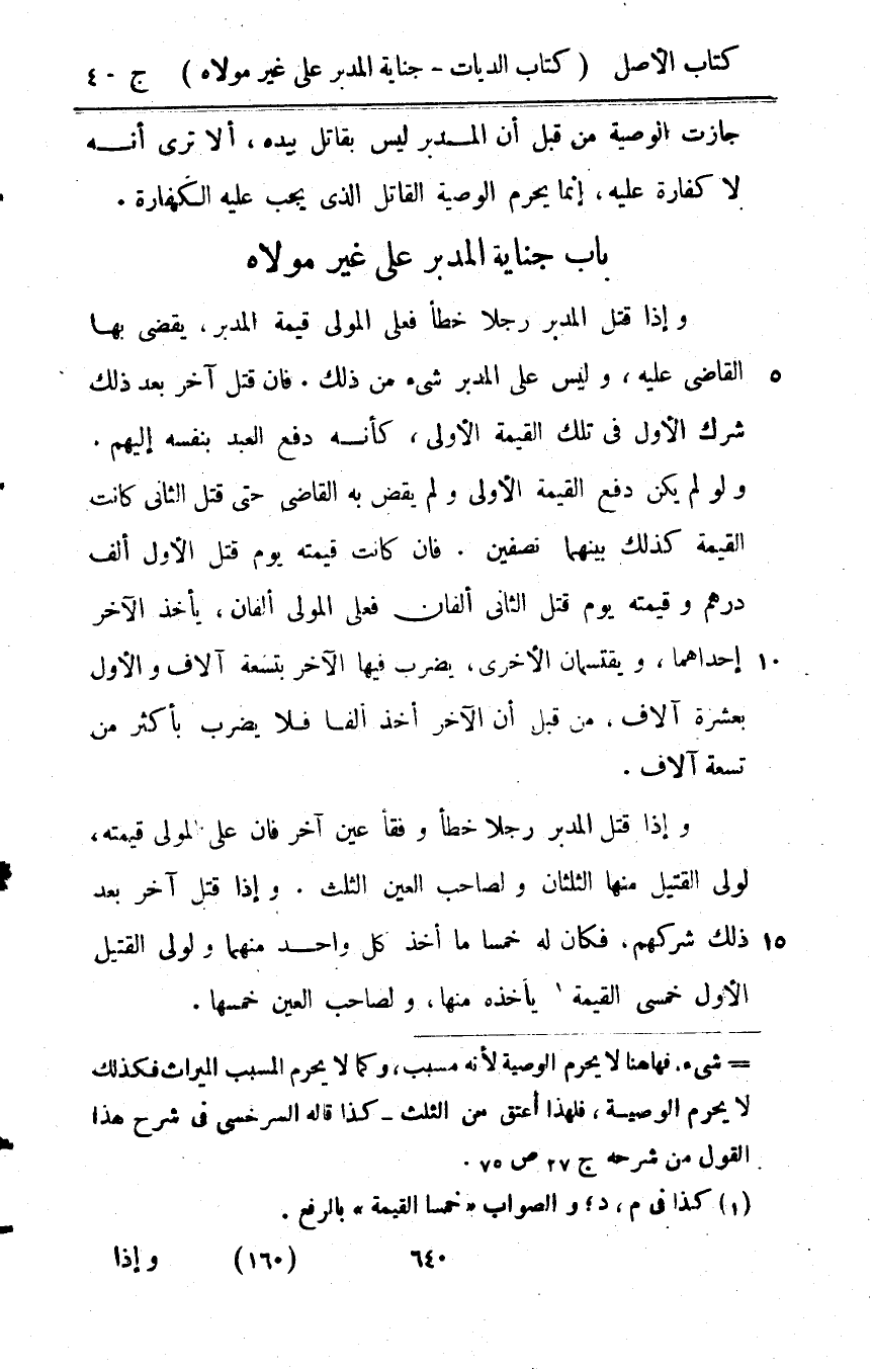 وَإِذا قتل الْمُدبر رجلا خطأ فعلى الْمولى قيمَة الْمُدبر يقْضِي بهَا القَاضِي عَلَيْهِ وَلَيْسَ على الْمُدبر شَيْء من ذَلِك فان قتل آخر بعد ذَلِك شرك الأول فِي تِلْكَ الْقيمَة الأولى كَأَنَّهُ دفع العَبْد بِنَفسِهِ إِلَيْهِم وَلَو لم يكن دفع الْقيمَة الأولى وَلم يقْض بِهِ القَاضِي حَتَّى قتل الثَّانِي كَانَت الْقيمَة كَذَلِك بَينهمَا نِصْفَيْنِ فان كَانَت قِيمَته يَوْم قتل الأول ألف دِرْهَم وَقِيمَته يَوْم قتل الثَّانِي أَلفَانِ فعلى الْمولى أَلفَانِ يَأْخُذ الآخر إِحْدَاهمَا ويقتسمان الْأُخْرَى يضْرب فِيهَا الآخر بِتِسْعَة آلَاف وَالْأول بِعشْرَة آلَاف من قبل أَن الآخر أَخذ ألفا فَلَا يضْرب بِأَكْثَرَ من تِسْعَة آلآف وَإِذا قتل الْمُدبر رجلا خطأ وفقأ عين آخر فان على الْمولى قِيمَته لولى الْقَتِيل مِنْهَا الثُّلُثَانِ وَلِصَاحِب الْعين الثُّلُث وَإِذا قتل آخر بعد ذَلِك شركهم فَكَانَ لَهُ خمْسا مَا أَخذ كل وَاحِد مِنْهُمَا ولولى الْقَتِيل الأول خمسى الْقيمَة يَأْخُذهُ مِنْهَا وَلِصَاحِب الْعين خمسها