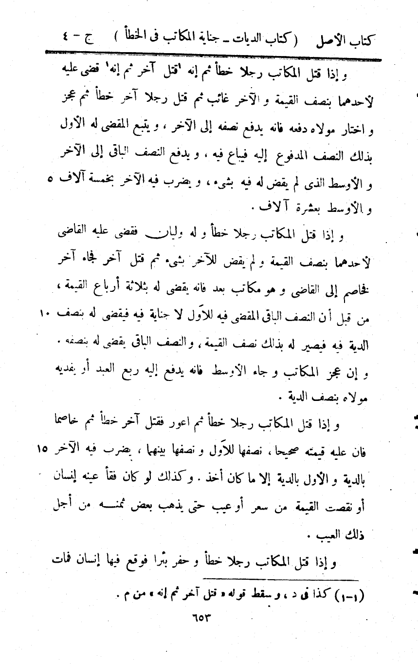 وَإِذا قتل الْمكَاتب رجلا خطأ ثمَّ إِنَّه قتل آخر ثمَّ إِنَّه قضي عَلَيْهِ لأَحَدهمَا بِنصْف الْقيمَة وَالْآخر غَائِب ثمَّ قتل رجلا آخر خطأ ثمَّ عجز وَاخْتَارَ مَوْلَاهُ دَفعه فانه يدْفع نصفه إِلَى الآخر وَيتبع الْمقْضِي لَهُ الأول بذلك النّصْف الْمَدْفُوع إِلَيْهِ فَيُبَاع فِيهِ وَيدْفَع النّصْف الْبَاقِي إِلَى الآخر والأوسط الَّذِي لم يقْض لَهُ فِيهِ بِشَيْء وَيضْرب فِيهِ الآخر بِخَمْسَة آلَاف والأوسط بِعشْرَة آلَاف