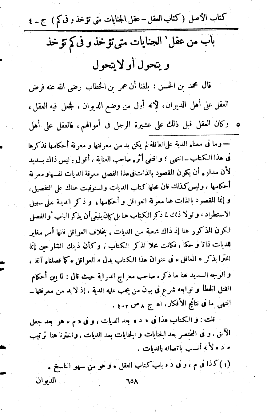 قَالَ مُحَمَّد بن الْحسن بلغنَا أَن عمر بن الْخطاب رَضِي الله عَنهُ فرض الْعقل على أهل الدِّيوَان لِأَنَّهُ أول من وضع الدِّيوَان فَجعل فِيهِ الْعقل وَكَانَ الْعقل قبل ذَلِك على عشيرة الرجل فِي أَمْوَالهم فالعقل على أهل