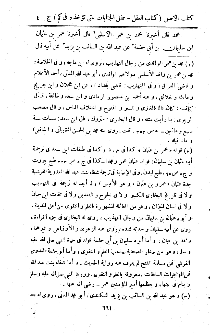 مُحَمَّد قَالَ أخبرنَا مُحَمَّد بن عمر الْأَسْلَمِيّ قَالَ أخبرنَا عمر بن عُثْمَان ابْن سُلَيْمَان بن أبي حثْمَة عَن عبد الله بن السَّائِب بن يزِيد عَن أَبِيه قَالَ