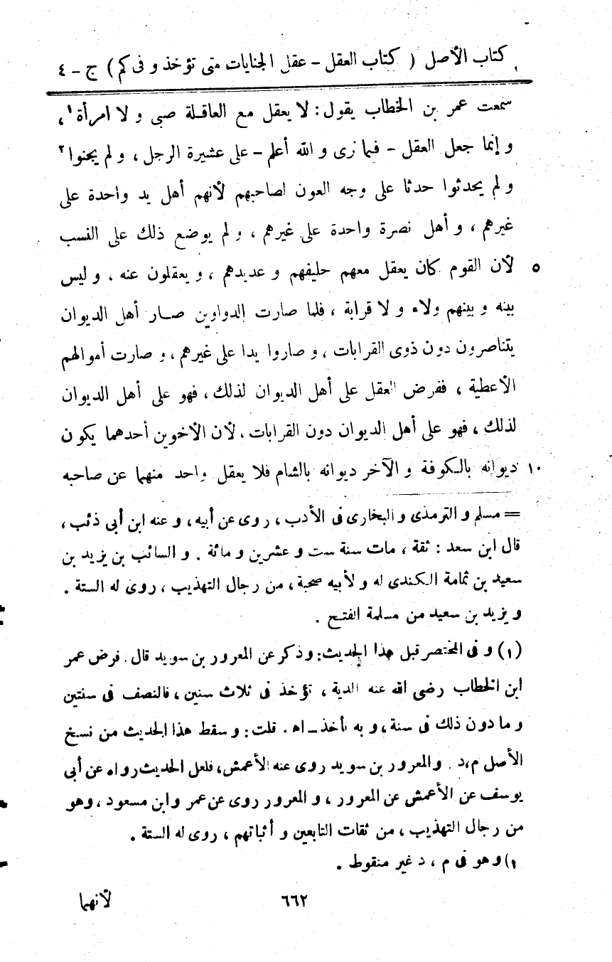 سَمِعت عمر بن الْخطاب يَقُول لَا يعقل مَعَ الْعَاقِلَة صبي وَلَا امْرَأَة وَإِنَّمَا جعل الْعقل فِيمَا نرى وَالله أعلم على عشيرة الرجل وَلم يجنوا وَلم يحدثوا حَدثا على وَجه العون لصَاحِبِهِمْ لأَنهم أهل يَد وَاحِدَة على غَيرهم وَأهل نصْرَة وَاحِدَة على غَيرهم وَلم يوضع ذَلِك على النّسَب لِأَن الْقَوْم كَانَ يعقل مَعَهم حليفهم وعديدهم ويعقلون عَنهُ وَلَيْسَ بَينه وَبينهمْ وَلَاء وَلَا قرَابَة فَلَمَّا صَارَت الدَّوَاوِين صَار أهل الدِّيوَان يتناصرون دون ذَوي الْقرَابَات وصاروا يدا على غَيرهم وَصَارَت أَمْوَالهم الأعطية فَفرض الْعقل على أهل الدِّيوَان لذَلِك فَهُوَ على أهل الدِّيوَان لذَلِك فَهُوَ على أهل الدِّيوَان دون الْقرَابَات لِأَن الْأَخَوَيْنِ أَحدهمَا يكونن ديوانه بِالْكُوفَةِ وَالْآخر ديوانه بِالشَّام فَلَا يعقل وَاحِد مِنْهُمَا عَن صَاحبه