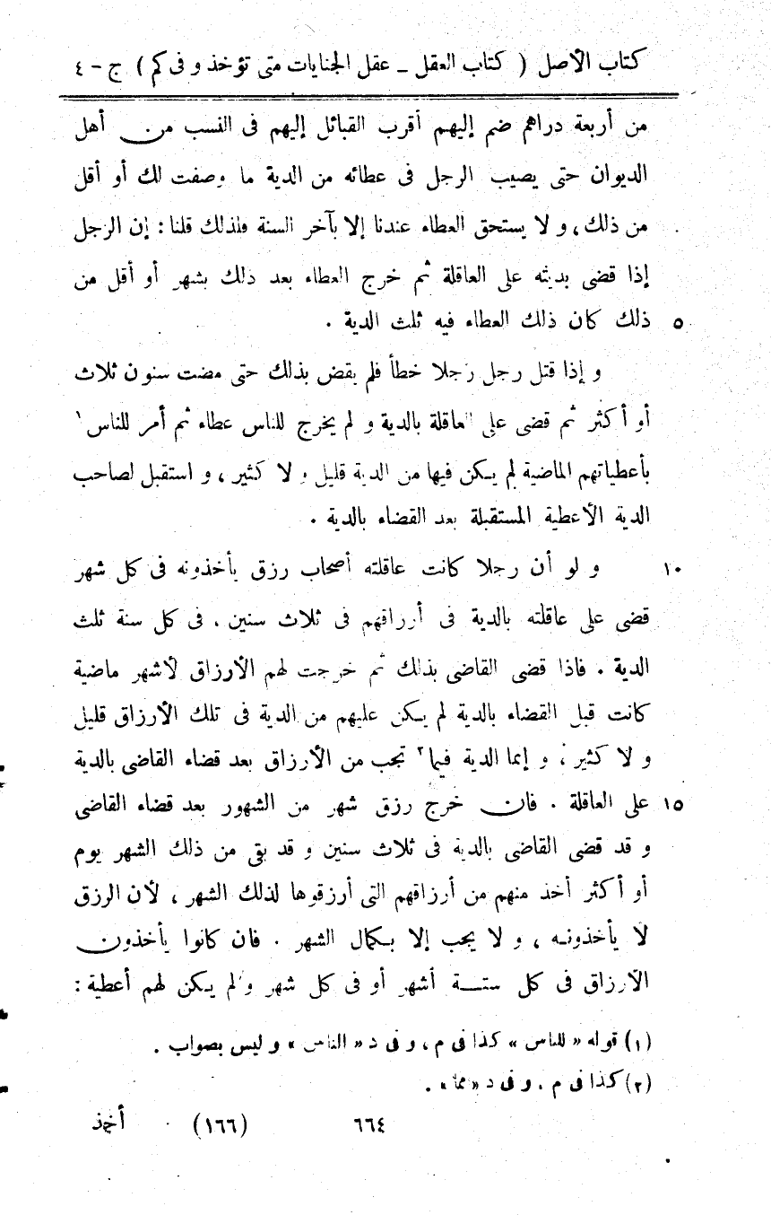 وَلَو أَن رجلا كَانَت عَاقِلَته أَصْحَاب رزق يأخذونه فِي كل شهر قضي على عَاقِلَته بِالدِّيَةِ فِي أَرْزَاقهم فِي ثَلَاث سِنِين فِي كل سنة ثلث الدِّيَة فاذا قضي القَاضِي بذلك ثمَّ خرجت لَهُم الأرزاق لأشهر مَاضِيَة كَانَت قبل الْقَضَاء بِالدِّيَةِ لم يكن عَلَيْهِم من الدِّيَة فِي تِلْكَ الأرزاق قَلِيل وَلَا كثير وَإِنَّمَا الدِّيَة فِيمَا تجب من الأرزاق بعد قَضَاء القَاضِي بِالدِّيَةِ على الْعَاقِلَة فان خرج رزق شهر من الشُّهُور بعد قَضَاء القَاضِي وَقد قضي القَاضِي بِالدِّيَةِ فِي ثَلَاث سِنِين وَقد بَقِي من ذَلِك الشَّهْر يَوْم أَو أَكثر أَخذ مِنْهُم من أَرْزَاقهم الَّتِي أرزقوها لذَلِك الشَّهْر لِأَن الرزق لَا يأخذونه لَا يجب إِلَّا بِكَمَال الشَّهْر فان كَانُوا يَأْخُذُونَ الأرزاق فِي كل سِتَّة أشهر أَو فِي كل شهر وَلم يكن لَهُم أعطية