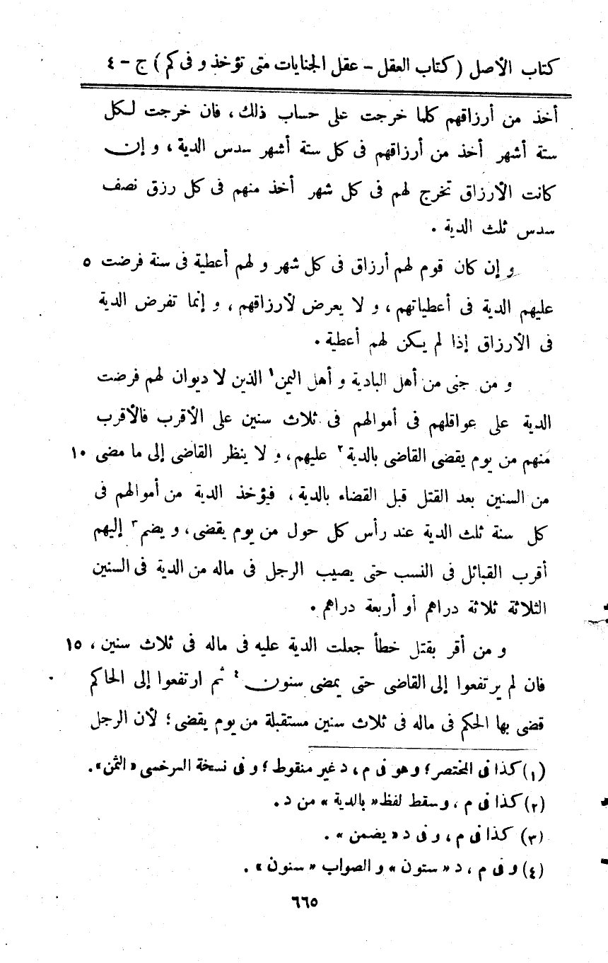 فِي أعطياتهم وَلَا يعرض لأرزاقهم وَإِنَّمَا تفرض الدِّيَة فِي الأرزاق إِذا لم يكن لَهُم أعطية وَمن جنى من أهل الْبَادِيَة وَأهل الْيمن الَّذين لَا ديوَان لَهُم فرضت الدِّيَة على عواقلهم فِي أَمْوَالهم فِي ثَلَاث سِنِين على الْأَقْرَب فَالْأَقْرَب مِنْهُم من يَوْم يقْضِي القَاضِي بِالدِّيَةِ عَلَيْهِم وَلَا ينظر القَاضِي إِلَى مَا مضى من السنين بعد الْقَتْل قبل الْقَضَاء بِالدِّيَةِ فَيُؤْخَذ الدِّيَة من أَمْوَالهم فِي كل سنة ثلث الدِّيَة عِنْد رَأس كل حول من يَوْم يقْضِي وَيضم إِلَيْهِم أقرب الْقَبَائِل فِي النّسَب حَتَّى يُصِيب الرجل فِي مَاله من الدِّيَة فِي السنين الثَّلَاثَة ثَلَاثَة دَرَاهِم أَو أَرْبَعَة دَرَاهِم وَمن أقرّ بقتل خطأ جعلت الدِّيَة عَلَيْهِ فِي مَاله فِي ثَلَاث سِنِين فان لم يرتفعوا إِلَى القَاضِي حَتَّى يمْضِي سنُون ثمَّ ارتفعوا إِلَى الْحَاكِم قضي بهَا الحكم فِي مَاله فِي ثَلَاث سِنِين مُسْتَقْبلَة من يَوْم يقْضِي لِأَن الرجل
