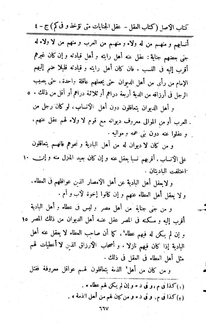 أنسابهم وَمِنْهُم من لَهُ وَلَاء وَمِنْهُم من الْعَرَب وَمِنْهُم من لَا وَلَاء لَهُ جنى بَعضهم جِنَايَة عقل عَنهُ أهل رايته وَأهل قيادته وَإِن كَانَ غَيرهم أقرب إِلَيْهِ فِي النّسَب فان كَانَ أهل رايته وقيادته قَلِيلا ضم إِلَيْهِم الإِمَام من رأى من أهل الدِّيوَان حَتَّى يجعلهم عَاقِلَة وَاحِدَة حَتَّى يُصِيب الرجل فِي أرزاقه من الدِّيَة أَرْبَعَة دَرَاهِم أَو ثَلَاثَة دَرَاهِم أَو أقل من ذَلِك وَأهل الدِّيوَان يتعاقلون دون أهل الْأَنْسَاب لَو كَانَ رجل من الْعَرَب أَو من الموَالِي مَعْرُوف ديوانه مَعَ قوم لَا وَلَاء لَهُم عقل عَنْهُم وعقلوا عَنهُ دون بنى عَمه ومواليه وَمن كَانَ لَا ديوَان لَهُ من أهل الْبَادِيَة وَنَحْوهم فانهم يتعاقلون على الْأَنْسَاب أقربهم نسبا يعقل عَنهُ وَإِن كَانَ بعيد الْمنزل مِنْهُ وَإِن اخْتلفت الباديتان وَلَا يعقل أهل الْبَادِيَة عَن أهل الْأَمْصَار الَّذِي عواقلهم فِي الْعَطاء وَلَا يعقل أهل الْعَطاء عَنْهُم وَإِن كَانُوا إخْوَة الْأَب وَأم