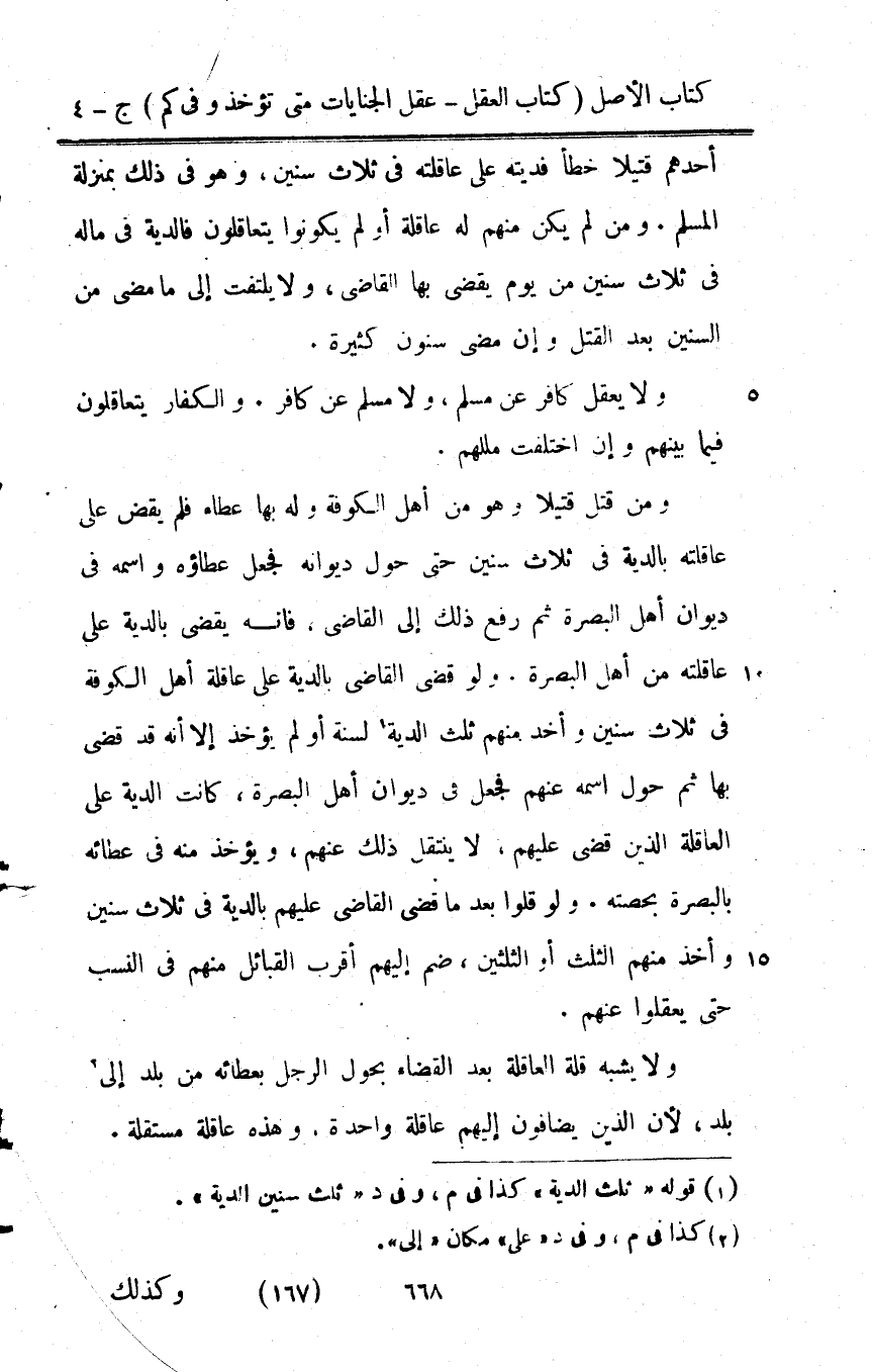 وَمن قتل قَتِيلا وَهُوَ من أهل الْكُوفَة وَله بهَا عَطاء فَلم يقْض على عَاقِلَته بِالدِّيَةِ فِي ثَلَاث سِنِين حَتَّى حول ديوانه فَجعل عطاؤه واسْمه فِي ديوَان أهل الْبَصْرَة ثمَّ رَجَعَ ذَلِك إِلَى القَاضِي فانه يقْضِي بِالدِّيَةِ على عَاقِلَته من أهل الْبَصْرَة وَلَو قضي القَاضِي بِالدِّيَةِ على عَاقِلَة أهل الْكُوفَة فِي ثَلَاث سِنِين وَأخذ مِنْهُم ثلث ب الدِّيَة لسنة أَو لم يُؤْخَذ إِلَّا أَنه قد قضي بهَا ثمَّ حول اسْمه عَنْهُم فَجعل فِي ديوَان أهل الْبَصْرَة كَانَت الدِّيَة على الْعَاقِلَة الَّذين قضي عَلَيْهِم لَا ينْتَقل ذَلِك عَنْهُم وَيُؤْخَذ مِنْهُ فِي عطائه بِالْبَصْرَةِ بِحِصَّتِهِ وَلَو قلوا بعد مَا قضي القَاضِي عَلَيْهِم بِالدِّيَةِ فِي ثَلَاث سِنِين وَأخذ مِنْهُم الثُّلُث أَو الثُّلثَيْنِ ضم إِلَيْهِم أقرب الْقَبَائِل مِنْهُم فِي النّسَب حَتَّى يعقلوا عَنْهُم وَلَا يشبه قلَّة الْعَاقِلَة بعد الْقَضَاء بحول الرجل بعطائه من بلد إِلَى بلد لِأَن الَّذين يضافون إِلَيْهِم عَاقِلَة وَاحِدَة وَهَذِه عَاقِلَة مُسْتَقلَّة