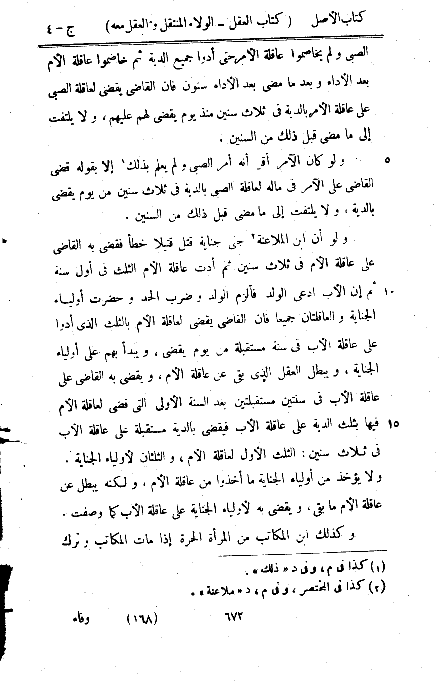 الصَّبِي وَلم يخاصموا عَاقِلَة الْآمِر حَتَّى أَدّوا جَمِيع الدِّيَة ثمَّ خاصموا عَاقِلَة الْأُم بعد الْأَدَاء وَبعد مَا مضى بعد الْأَدَاء سنُون فان القَاضِي يقْضِي لعاقلة الصَّبِي على عَاقِلَة الْآمِر الدِّيَة فِي ثَلَاث سِنِين مُنْذُ يَوْم يقْضِي لَهُم عَلَيْهِم وَلَا يلْتَفت إِلَى مَا مضى قبل ذَلِك من السنين وَلَو كَانَ الْآمِر أقرّ أَنه أَمر الصَّبِي وَلم يعلم بذلك إِلَّا بقوله قضي القَاضِي على الْآمِر فِي مَاله لعاقلة الصَّبِي بِالدِّيَةِ فِي ثَلَاث سِنِين من يَوْم يقْضِي بِالدِّيَةِ وَلَا يلْتَفت إِلَى مَا مضى قبل ذَلِك من السنين وَلَو أَن ابْن الْمُلَاعنَة جنى جِنَايَة قتل قَتِيلا خطأ فقضي بِهِ القَاضِي على عَاقِلَة الْأُم فِي ثَلَاث سِنِين ثمَّ أدَّت عَاقِلَة الْأُم الثُّلُث فِي أول سنة ثمَّ إِن الْأَب ادّعى الْوَلَد فألزم الْوَلَد وَضرب الْحَد وَحَضَرت أَوْلِيَاء الْجِنَايَة والعاقلتان جَمِيعًا فان القَاضِي يقْضِي لعاقلة الْأُم بِالثُّلثِ الَّذِي أَدّوا على عَاقِلَة الْأَب فِي سنة مُسْتَقْبلَة من يَوْم يقْضِي وَيبدأ بهم على أَوْلِيَاء الْجِنَايَة وَيبْطل الْعقل الَّذِي بَقِي عَن عَاقِلَة الْأُم وَيَقْضِي بِهِ القَاضِي على عَاقِلَة الْأَب فِي سِنِين مستقبلتين بعد السّنة الأولى الَّتِي قضي لعاقلة الْأُم فِيهَا بِثلث الدِّيَة على عَاقِلَة الْأَب فَيَقْضِي بِالدِّيَةِ مُسْتَقْبلَة على عَاقِلَة الْأَب فِي ثَلَاث سِنِين الثُّلُث الأول لعاقلة الْأُم وَالثُّلُثَانِ لأولياء الْجِنَايَة وَلَا يُؤْخَذ من أَوْلِيَاء الْجِنَايَة مَا أخذُوا من عَاقِلَة الْأُم وَلكنه يبطل عَن عَاقِلَة الْأُم مَا بقى بِهِ الْأَوْلِيَاء الْجِنَايَة على عَاقِلَة الْأَب كَمَا وصفت وَكَذَلِكَ ابْن الْمكَاتب من الْمَرْأَة الْحرَّة إِذا مَاتَ الْمكَاتب وَترك