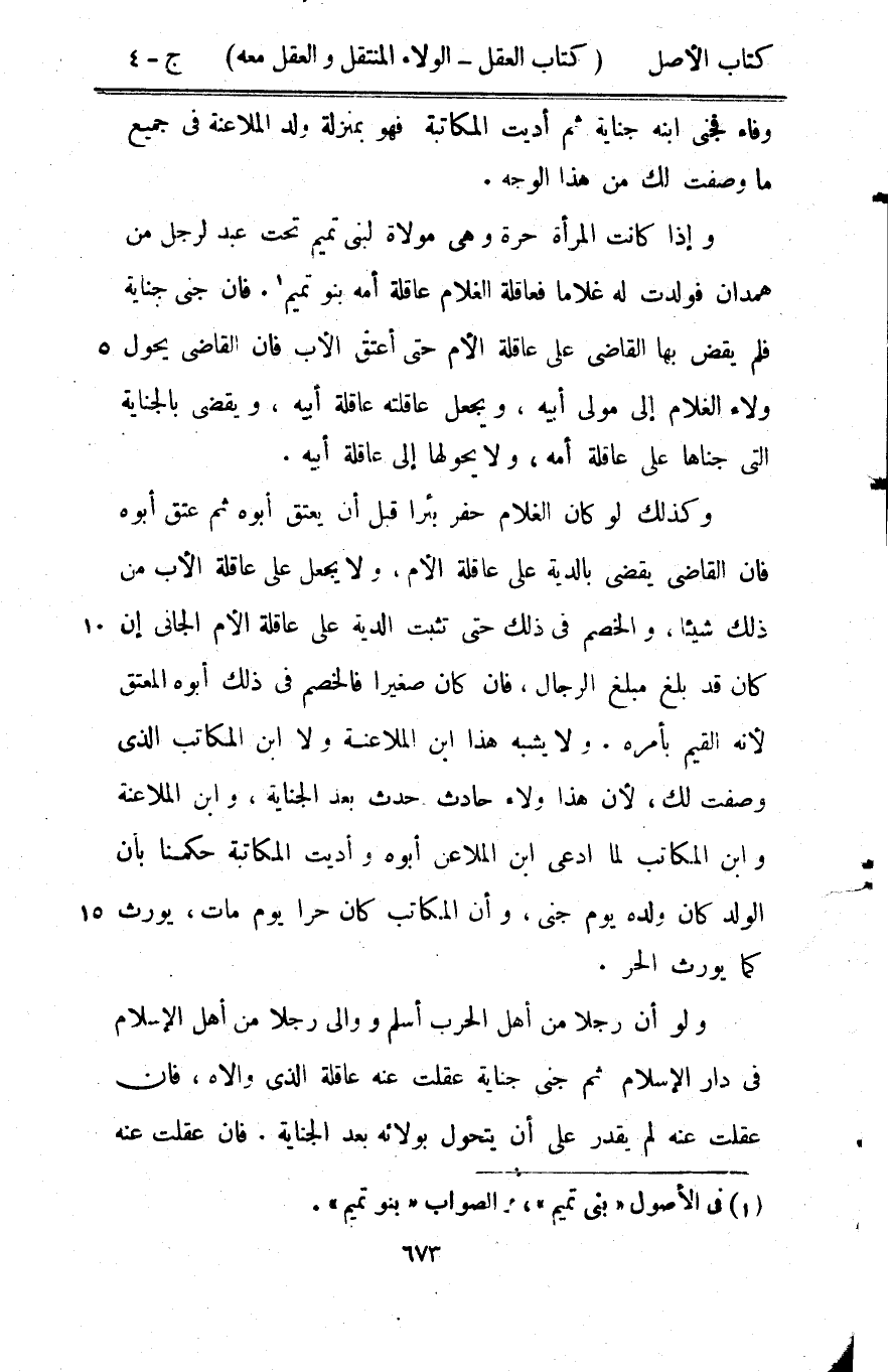 وَإِذا كَانَت الْمَرْأَة حرَّة وَهِي مولاة لبني تَمِيم تَحت عبد لرجل من هَمدَان فَولدت لَهُ غُلَاما فعاقلة الْغُلَام عَاقِلَة أمه بَنو تَمِيم فان جنى جِنَايَة فَلم يقْض بهَا القَاضِي على عَاقِلَة الْأُم حَتَّى أعتق الْأَب فان القَاضِي يحول وَلَاء الْغُلَام إِلَى مولى أَبِيه وَيجْعَل عَاقِلَته عَاقِلَة أَبِيه وَيَقْضِي بِالْجِنَايَةِ الَّتِي جناها على عَاقِلَة أمه وَلَا يحولها إِلَى عَاقِلَة أَبِيه وَكَذَلِكَ لَو كَانَ الْغُلَام حفر بِئْرا قبل أَن يعْتق أَبوهُ ثمَّ عتق أَبوهُ فان القَاضِي يقْضِي بِالدِّيَةِ على عَاقِلَة الْأُم وَلَا يَجْعَل على عَاقِلَة الْأَب من ذَلِك شَيْئا والخصم فِي ذَلِك حَتَّى تثبت الدِّيَة على عَاقِلَة الْأُم الْجَانِي إِن كَانَ قد بلغ مبلغ الرِّجَال فان كَانَ صَغِيرا فالخصم فِي ذَلِك أَبوهُ الْمُعْتق لِأَنَّهُ الْقيم بأَمْره وَلَا يشبه هَذَا ابْن الْمُلَاعنَة وَلَا ابْن الْمكَاتب الَّذِي وصفت لَك لِأَن هَذَا وَلَاء حَادث حدث بعد الْجِنَايَة وَابْن الْمُلَاعنَة وَابْن الْمكَاتب لما ادّعى ابْن الْملَاعن أَبوهُ وَأديت الْمُكَاتبَة حكمنَا بِأَن الْوَلَد كَانَ وَلَده يَوْم جنى وَأَن الْمكَاتب كَانَ حرا يَوْم مَاتَ يُورث كَمَا يُورث الْحر