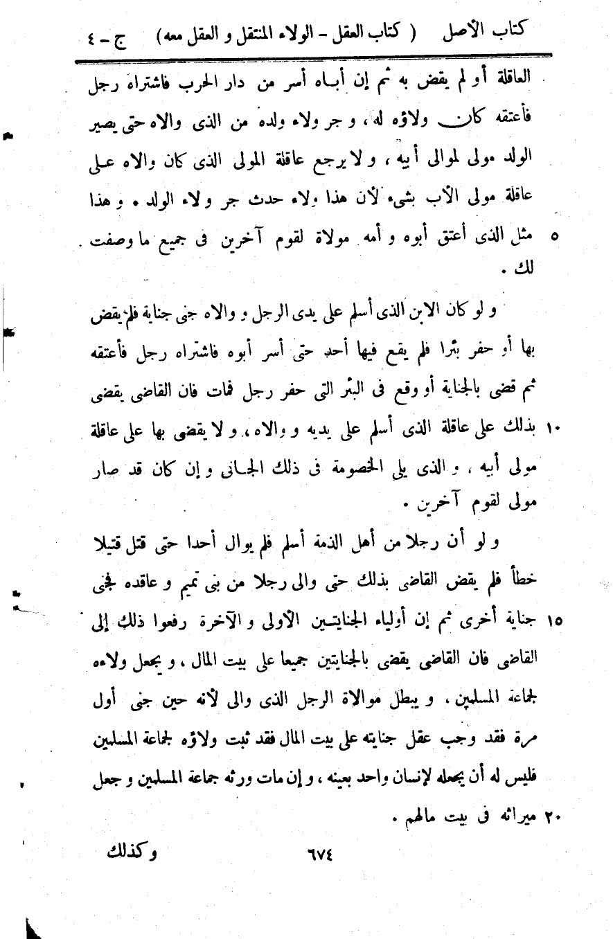 الْعَاقِلَة أَو لم يقْض بِهِ ثمَّ إِن أَبَاهُ أسر من دَار الْحَرْب فَاشْتَرَاهُ رجل فَأعْتقهُ كَانَ وَلَاؤُه لَهُ وجر وَلَاء وَلَده من الَّذِي وَالَاهُ حَتَّى يصير الْوَلَد مولى لموَالِي ابيه وَلَا يرجع عَاقِلَة الْمولى الَّذِي كَانَ وَالَاهُ على عَاقِلَة مولى الْأَب بِشَيْء لِأَن هَذَا وَلَاء حدث جر وَلَاء الْوَلَد وَهَذَا مثل الَّذِي أعتق أَبوهُ وَأمه مولاة لقوم آخَرين فِي جَمِيع مَا وصفت لَك وَلَو كَانَ الابْن الَّذِي أسلم على يَدي الرجل ووالاه جنى جِنَايَة فَلم يقْض بهَا أَو حفر بِئْرا فَلم يَقع فِيهَا أحد حَتَّى أسر أَبوهُ فَاشْتَرَاهُ رجل فَأعْتقهُ ثمَّ قضي بِالْجِنَايَةِ أَو وَقع فِي الْبِئْر الَّتِي حفر رجل فَمَاتَ فان القَاضِي يقْضِي بذلك على عَاقِلَة الَّذِي أسلم على يَدَيْهِ ووالاه وَلَا يقْضِي بهَا على عَاقِلَة مولى ابيه وَالَّذِي يَلِي الْخُصُومَة فِي ذَلِك الْجَانِي إِن كَانَ قد صَار مولى لقوم آخَرين وَلَو أَن رجلا من أهل الذِّمَّة أسلم فَلم يوال أحدا حَتَّى قتل قَتِيلا خطأ فَلم يقْض القَاضِي بذلك حَتَّى والى رجلا من بني تَمِيم وعاقده فجنى جِنَايَة أُخْرَى ثمَّ إِن أَوْلِيَاء الجنايتين الأولى وَالْآخِرَة رفعوا ذَلِك إِلَى القَاضِي فان القَاضِي يقْضِي بالجنايتين جَمِيعًا على بَيت المَال وَيجْعَل ولاءه لجَماعَة الْمُسلمين وَيبْطل مُوالَاة الرجل الَّذِي والى لِأَنَّهُ حِين جنى أول مرّة فقد وَجب عقل جِنَايَته على بَيت المَال فقد ثَبت وَلَاؤُه لجَماعَة الْمُسلمين فَلَيْسَ لَهُ أَن يَجعله لإِنْسَان وَاحِد بِعَيْنِه وَإِن مَاتَ وَرَثَة جمَاعَة الْمُسلمين وَجعل مِيرَاثه فِي بَيت مَالهم