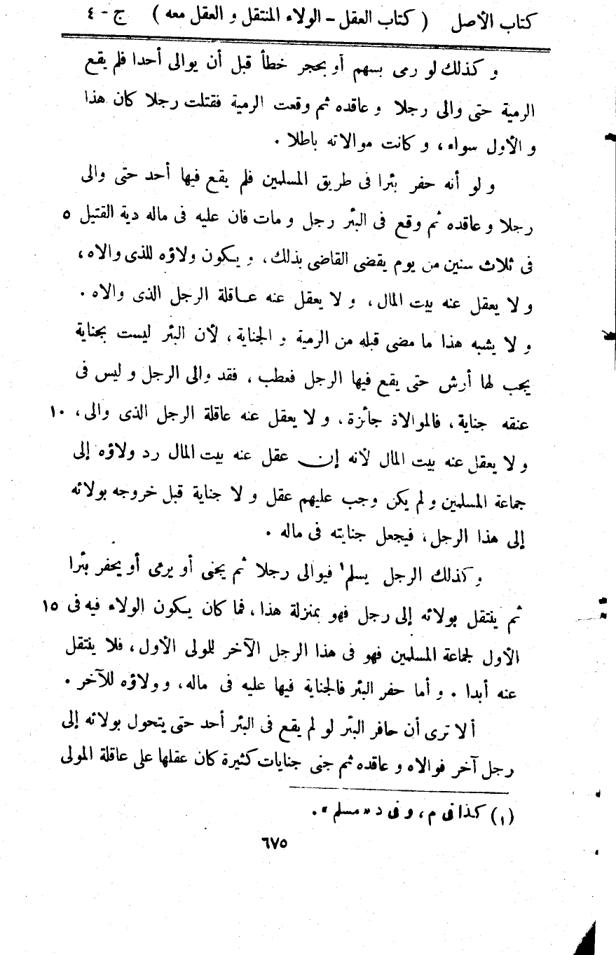 لَو رمى بِسَهْم أَو بِحجر خطأ قبل أَن يوالي أحدا فَلم يَقع الرَّمية حَتَّى والى رجلا وعاقده ثمَّ وَقعت الرَّمية فقتلت رجلا كَانَ هَذَا وَالْأول سَوَاء وَكَانَت موالاته بَاطِلا وَلَو أَنه حفر بِئْرا فِي طَرِيق الْمُسلمين فَلم يَقع فِيهَا أحد حَتَّى والى رجلا وعاقده ثمَّ وَقع فِي الْبِئْر رجلا وَمَات فان عَلَيْهِ فِي مَاله دِيَة الْقَتِيل فِي ثَلَاث سِنِين من يَوْم يقْضِي القَاضِي بذلك وَيكون وَلَاؤُه للَّذي وَالَاهُ وَلَا يعقل عَنهُ بَيت المَال وَلَا يعقل عَنهُ عَاقِلَة الرجل الَّذِي وَالَاهُ وَلَا يشبه هَذَا مَا مضى قبله من الرَّمية وَالْجِنَايَة لِأَن الْبِئْر لَيست بِجِنَايَة يجب لَهَا أرش حَتَّى يَقع فِيهَا الرجل فَعَطب فقد والى الرجل لَيْسَ فِي عُنُقه جِنَايَة فالمولاه جَائِزَة وَلَا يعقل عَنهُ عَاقِلَة الرجل الَّذِي والى وَلَا يعقل عَنهُ بَيت المَال لِأَنَّهُ إِن عقل عَنهُ بَيت المَال رد وَلَاؤُه إِلَى جمَاعَة الْمُسلمين وَلم يكن وَجب عَلَيْهِم عقل وَلَا جِنَايَة قبل خُرُوجه بولائه إِلَى هَذَا الرجل فَيجْعَل جِنَايَته فِي مَاله وَكَذَلِكَ الرجل يسلم فيوالي رجلا ثمَّ يجني أَو يَرْمِي أَو يحْفر بِئْرا ثمَّ ينْتَقل بولائه إِلَى رجل فَهُوَ بِمَنْزِلَة هَذَا فَمَا كَانَ يكون الْوَلَاء فِيهِ فِي الأول لجَماعَة الْمُسلمين فَهُوَ فِي هَذَا الرجل الآخر للْمولى الأول فَلَا ينْتَقل عَنهُ أبدا وَأما حفر الْبِئْر فالجناية فِيهَا عَلَيْهِ فِي مَاله وَوَلَاؤُهُ للْآخر أَلا ترى أَن حافر الْبِئْر لَو لم يَقع فِي الْبِئْر أحد حَتَّى يتَحَوَّل بولائه إِلَى رجل آخر فوالاه وعاقده ثمَّ جنى جنايات كَثِيرَة كَانَ عقلهَا على عَاقِلَة الْمولى