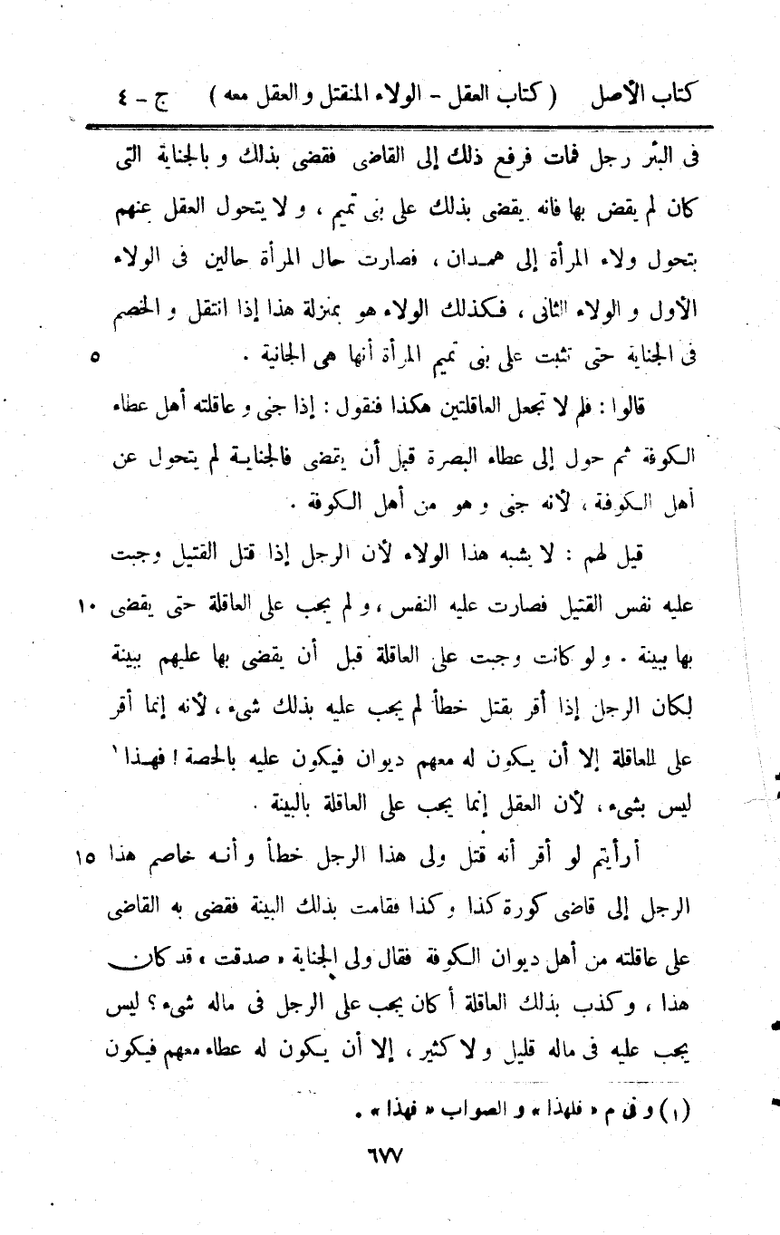 فِي الْبِئْر رجل فَمَاتَ فَرفع ذَلِك إِلَى القَاضِي فقضي بذلك وبالجناية الَّتِي كَانَ لم يقْض بهَا فانه يقْضِي بذلك على بني تَمِيم وَلَا يتَحَوَّل الْعقل عَنْهُم بتحول وَلَاء الْمَرْأَة إِلَى هَمدَان فَصَارَت حَال الْمَرْأَة حَالين فِي الْوَلَاء الأول وَالْوَلَاء الثَّانِي فَكَذَلِك الْوَلَاء هُوَ بِمَنْزِلَة هَذَا إِذا انْتقل والخصم فِي الْجِنَايَة حَتَّى تثبت على بني تَمِيم الْمَرْأَة أَنَّهَا هِيَ الجانية قَالُوا فَلم لَا تجْعَل العاقلتين هَكَذَا مَنْقُول إِذا جنى وعاقلته أهل عطاه الْكُوفَة ثمَّ حول إِلَى عَطاء الْبَصْرَة قبل أَن يقْضِي فالجناية لم يتَحَوَّل عَن أهل الْكُوفَة لِأَنَّهُ جنى وَهُوَ من أهل الْكُوفَة قيل لَهُم لَا يشبه هَذَا الْوَلَاء لِأَن الرجل إِذا قتل الْقَتِيل وَجَبت عَلَيْهِ نفس الْقَتِيل فَصَارَت عَلَيْهِ النَّفس وَلم يجب على الْعَاقِلَة حَتَّى يقْضِي بهَا بِبَيِّنَة وَلَو كَانَت وَجَبت على الْعَاقِلَة قبل أَن يقْضِي بهَا عَلَيْهِم بِبَيِّنَة لَكَانَ الرجل إِذا أقرّ بقتل خطأ لم يجب عَلَيْهِ بذلك شَيْء لِأَنَّهُ إِنَّمَا أقرّ على الْعَاقِلَة إِلَّا أَن يكون لَهُ مَعَهم ديوَان فَيكون عَلَيْهِ بِالْحِصَّةِ فَهَذَا لَيْسَ بِشَيْء لِأَن الْعقل إِنَّمَا يجب على الْعَاقِلَة بِالْبَيِّنَةِ