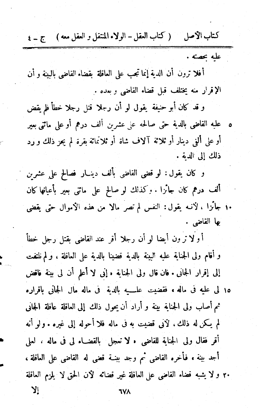 عَلَيْهِ بِحِصَّتِهِ أَفلا ترَوْنَ أَن الدِّيَة إِنَّمَا تجب على الْعَاقِلَة بِقَضَاء القَاضِي بِالْبَيِّنَةِ وَأَن الْإِقْرَار مِنْهُ يخْتَلف قبل قَضَاء القَاضِي وَبعده وَقد كَانَ أَبُو حنيفَة يَقُول لَو أَن رجلا قتل رجلا خطأ فَلم يقْض عَلَيْهِ القَاضِي بِالدِّيَةِ حَتَّى صَالحه على عشْرين ألف دِرْهَم أَو على مِائَتي بعير أَو على أَلفَيْنِ دِينَار أَو ثَلَاثَة آلَاف شَاة أَو ثَلَاثمِائَة بقرة لم يجز ذَلِك ورد ذَلِك إِلَى الدِّيَة وَكَانَ يَقُول لَو قضي القَاضِي بِأَلف دِينَار فَصَالح على عشْرين ألف دِرْهَم كَانَ جَائِزا وَكَذَلِكَ لَو صَالح على مِائَتي بعير بِأَعْيَانِهَا كَانَ جَائِزا لِأَنَّهُ يَقُول النَّفس لم تصر مَالا من هَذِه الْأَمْوَال حَتَّى يقْضِي بهَا القَاضِي أَو لَا ترَوْنَ أَيْضا لَو أَن رجلا أقرّ عِنْد القَاضِي بقتل رجل خطأ واقام ولي الْجِنَايَة عَلَيْهِ الْبَيِّنَة بِالدِّيَةِ قضينا بِالدِّيَةِ على الْعَاقِلَة وَلم نلتفت إِلَى إِقْرَار الْجَانِي فان قَالَ ولي الْجِنَايَة إِنِّي لَا أعلم أَن لي بَيِّنَة فَاقْض لي عَلَيْهِ فِي مَاله فَقضيت عَلَيْهِ بِالدِّيَةِ فِي مَاله مَال الْجَانِي باقراره ثمَّ اصاب ولي الْجِنَايَة بَيِّنَة وَأَرَادَ أَن يحول ذَلِك إِلَى الْعَاقِلَة عَاقِلَة الْجَانِي لم يكن لَهُ ذَلِك لِأَنِّي قضيت بِهِ فِي مَاله فَلَا أحوله إِلَى غَيره وَلَو أَنه أقرّ فَقَالَ ولي الْجِنَايَة للْقَاضِي لَا تعجل بِالْقضَاءِ لي فِي مَاله لعلى أجد بَينه فَأَخَّرَهُ القَاضِي ثمَّ وجد بَيِّنَة قضي لَهُ القَاضِي على الْعَاقِلَة وَلَا يشبه قَضَاء القَاضِي على الْعَاقِلَة غير قَضَائِهِ لِأَن الْحق لَا يلْزم الْعَاقِلَة