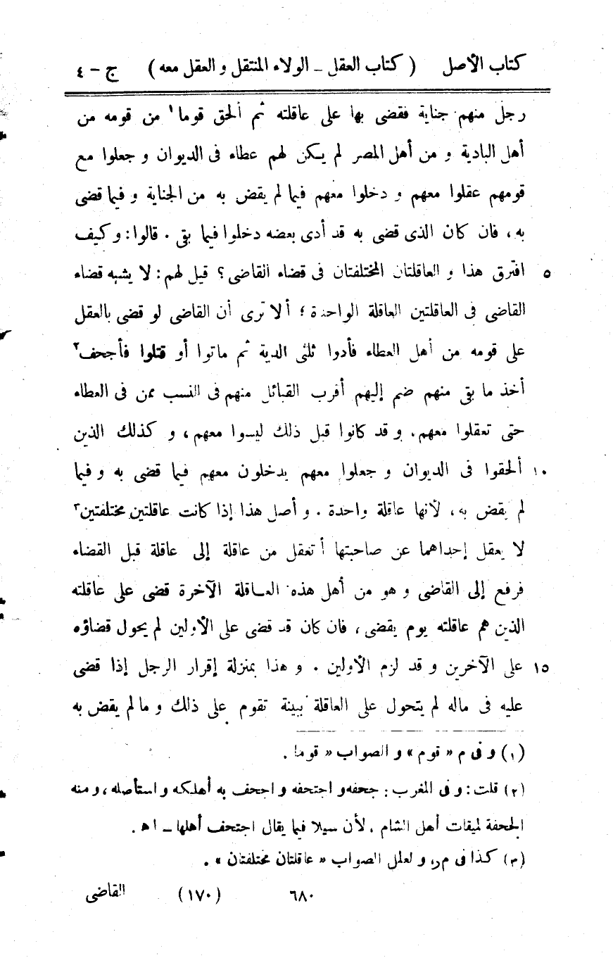 رجل مِنْهُم جِنَايَة فقضي بهَا على عَاقِلَته ثمَّ ألحق قوما من قومه من أهل الْبَادِيَة وَمن أهل الْمصر لم يكن لَهُم عَطاء فِي الدِّيوَان وَجعلُوا مَعَ قَومهمْ عقلوا مَعَهم ودخلوا مَعَهم فِيمَا لم يقْض بِهِ من الْجِنَايَة وَفِيمَا قضي بِهِ فان كَانَ الَّذِي قضي بِهِ قد أدّى بعضه دخلُوا فِيمَا بَقِي قَالُوا وَكَيف افترق هَذَا والعاقلتان المختلفان فِي قَضَاء القَاضِي قيل لَهُم لَا يشبه قَضَاء القَاضِي فِي العاقلتين الْعَاقِلَة الْوَاحِدَة أَلا ترى أَن القَاضِي لَو قضي بِالْعقلِ على قومه من أهل الْعَطاء فأدوا ثُلثي الدِّيَة ثمَّ مَاتُوا أوقتلوا فأجحف أَخذ مَا بَقِي مِنْهُم ضم إِلَيْهِم أقرب الْقَبَائِل مِنْهُم فِي النّسَب مِمَّن فِي الْعَطاء حَتَّى تعقلوا مَعَهم وَقد كَانُوا قبل ذَلِك لَيْسُوا مَعَهم وَكَذَلِكَ الَّذين ألْحقُوا فِي الدِّيوَان وَجعلُوا مَعَهم يدْخلُونَ مَعَهم فِيمَا قضي بِهِ وَفِيمَا لم يقْض بِهِ لِأَنَّهَا عَاقِلَة وَاحِدَة وأصل هَذَا إِذا كَانَت عاقلتين مختلفتين لَا يعقل إِحْدَاهمَا عَن صاحبتها أتعقل من عَاقِلَة إِلَى عَاقِلَة قبل الْقَضَاء فَرفع إِلَى القَاضِي وَهُوَ من أهل هَذِه الْعَاقِلَة الْآخِرَة قضي على عَاقِلَته الَّذِي هم عَاقِلَته يَوْم يقْضِي فان كَانَ قد قضي على الْأَوَّلين لم يحول قَضَاؤُهُ على الآخرين وَقد لزم الْأَوَّلين وَهَذَا بِمَنْزِلَة إِقْرَار الرجل إِذا قضي عَلَيْهِ فِي مَاله لم يتَحَوَّل على الْعَاقِلَة بِبَيِّنَة تقوم على ذَلِك وَمَا لم يقْض بِهِ