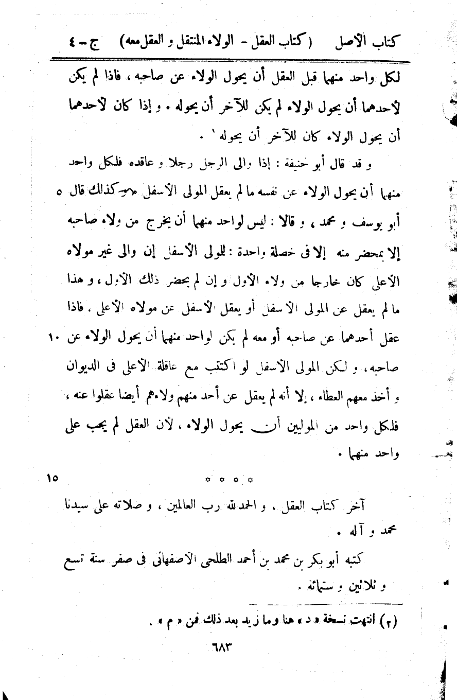 آخر كتاب الْعقل وَالْحَمْد الله رب الْعَالمين وَصلَاته على سيدنَا مُحَمَّد وَآله كتبه إبو بكر بن مُحَمَّد بن أَحْمد الطلحي الْأَصْفَهَانِي فِي صفر سنة تسع وَثَلَاثِينَ وسِتمِائَة