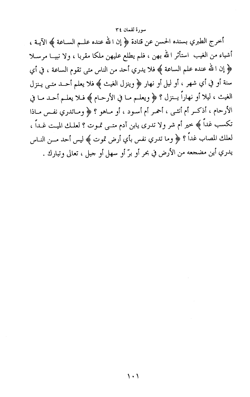 أخرج الطبري بسنده الحسن عن قتادة (إن الله عنده علم الساعة) الآية، أشياء من الغيب استأثر الله بهن، فلم يطلع عليهن ملكا مقربا، ولا نبيا مرسلا (إن الله عنده علم الساعة) فلا يدري أحد من الناس متى تقوم الساعة، في أي سنة أو في أي شهر، أو ليل أو نهار (وينزل الغيث) فلا يعدم أحد متى ينزل الغيث، ليلا أو نهاراً ينزل؟ (ويعلم ما في الأرحام) فلا يعلم أحد ما في الأرحام، أذكر أم أنثى، أحمر أم أسود، أو ما هو؟ (وما تدري نفس ماذا تكسب غداً) خير أم شر ولا تدرى يا ابن آدم متى تموت؟ لعلك الميت غداً، لعلك المصاب غداً؟ (وما تدري نفس بأي أرض تموت) ليس أحد من الناس يدري أين مضجعه من الأرض في بحر أو برّ أو سهل أو جبل، تعالى وتبارك.