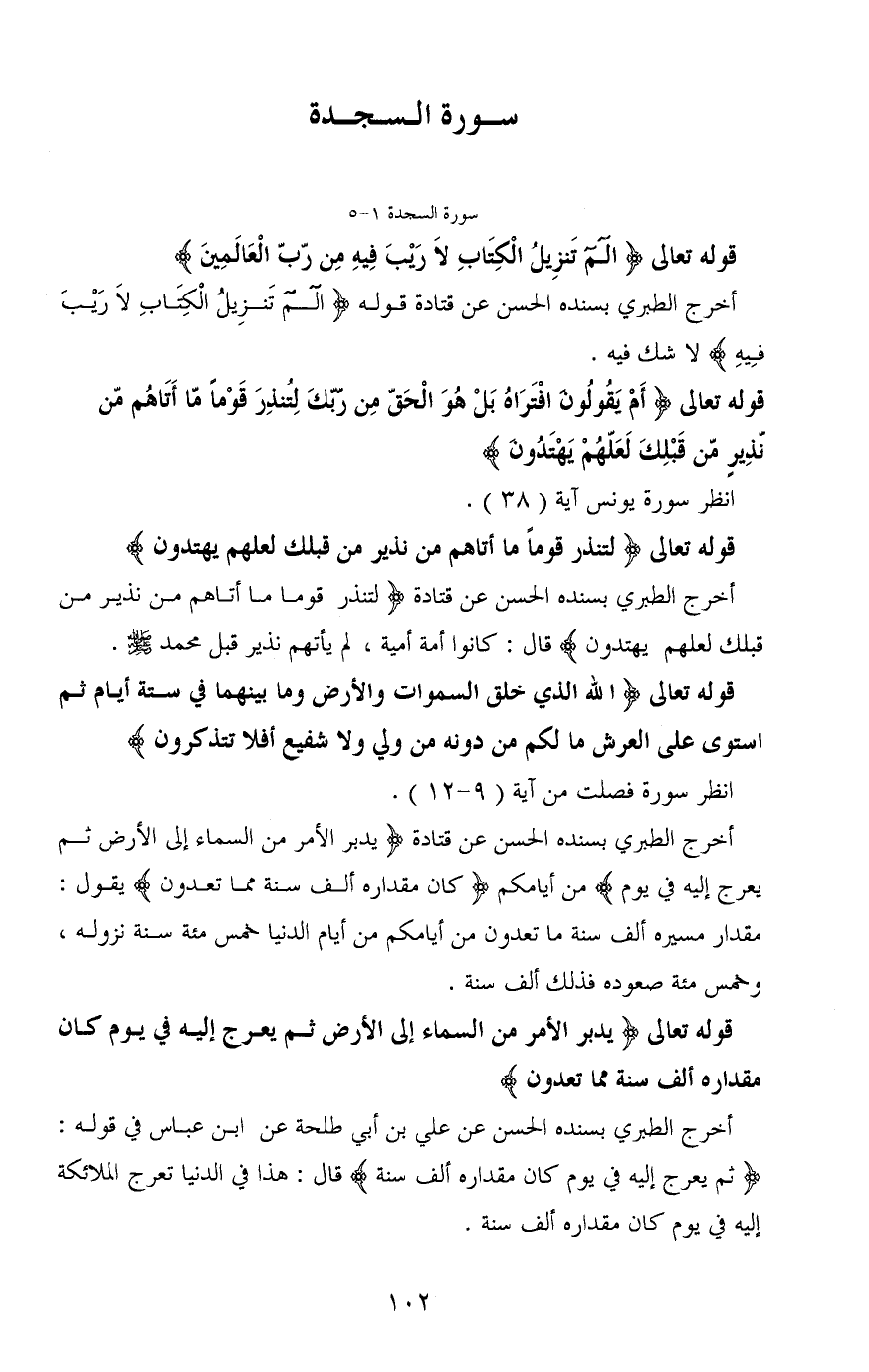 أخرج الطبري بسنده الحسن عن قتادة (يدبر الأمر من السماء إلى الأرض ثم يعرج إليه في يوم) من أيامكم (كان مقداره ألف سنة مما تعدون) يقول: مقدار مسيرة ألف سنة ما تعدون من أيامكم من أيام الدنيا خمس مئة سنة نزوله، وخمس مئة صعوده فذلك ألف سنة.