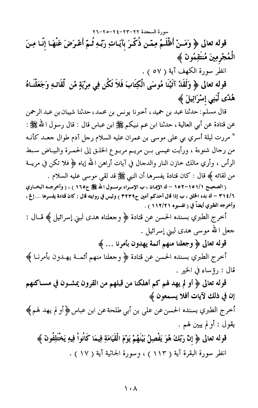 قال مسلم: حدثنا عبد بن حميد، أخبرنا يونس بن محمد، حدثنا شيبان بن عبد الرحمن عن قتادة عن أبي العالية، حدثنا ابن عم نبيكم - صَلَّى اللَّهُ عَلَيْهِ وَسَلَّمَ - ابن عباس قال: قال رسول الله - صَلَّى اللَّهُ عَلَيْهِ وَسَلَّمَ -: "مررت ليلة أسري بي على موسى بن عمران عليه السلام رجل آدم طوال جعد كأنه من رجال شنوءة، ورأيت عيسى بن مريم مربوع الخلق إلى الحمرة والبياض سبط الرأس، وأري مالك خازن النار والدجال في آيات أراهن الله إياه (فَلَا تَكُنْ فِي مِرْيَةٍ مِنْ لِقَائِهِ) قال: كان قتادة يفسرها أن النبي - صَلَّى اللَّهُ عَلَيْهِ وَسَلَّمَ - قد لقي موسى عليه السلام.