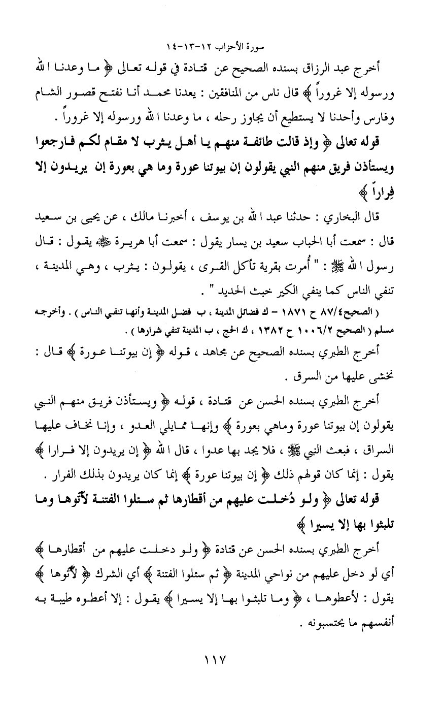 أخرج عبد الرزاق بسنده الصحيح عن قتادة في قوله تعالى (ما وعدنا الله ورسوله إلا غروراً) قال ناس من المنافقين: يعدنا محمد أنا نفتح قصور الشام وفارس وأحدنا لا يستطيع أن يجاوز رحله، ما وعدنا الله ورسوله إلا غروراً.