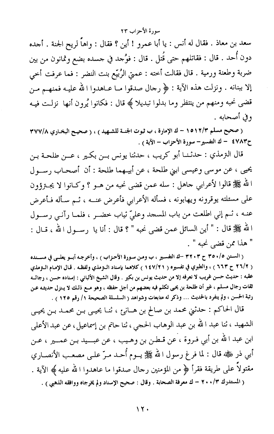 (صحيح مسلم 3/1512 - ك الإمارة، ب ثبوت الجنة للشهيد) ، (صحيح الطبري 8/377 ح4783 - ك التفسير - سورة الأحزاب - الآية) .