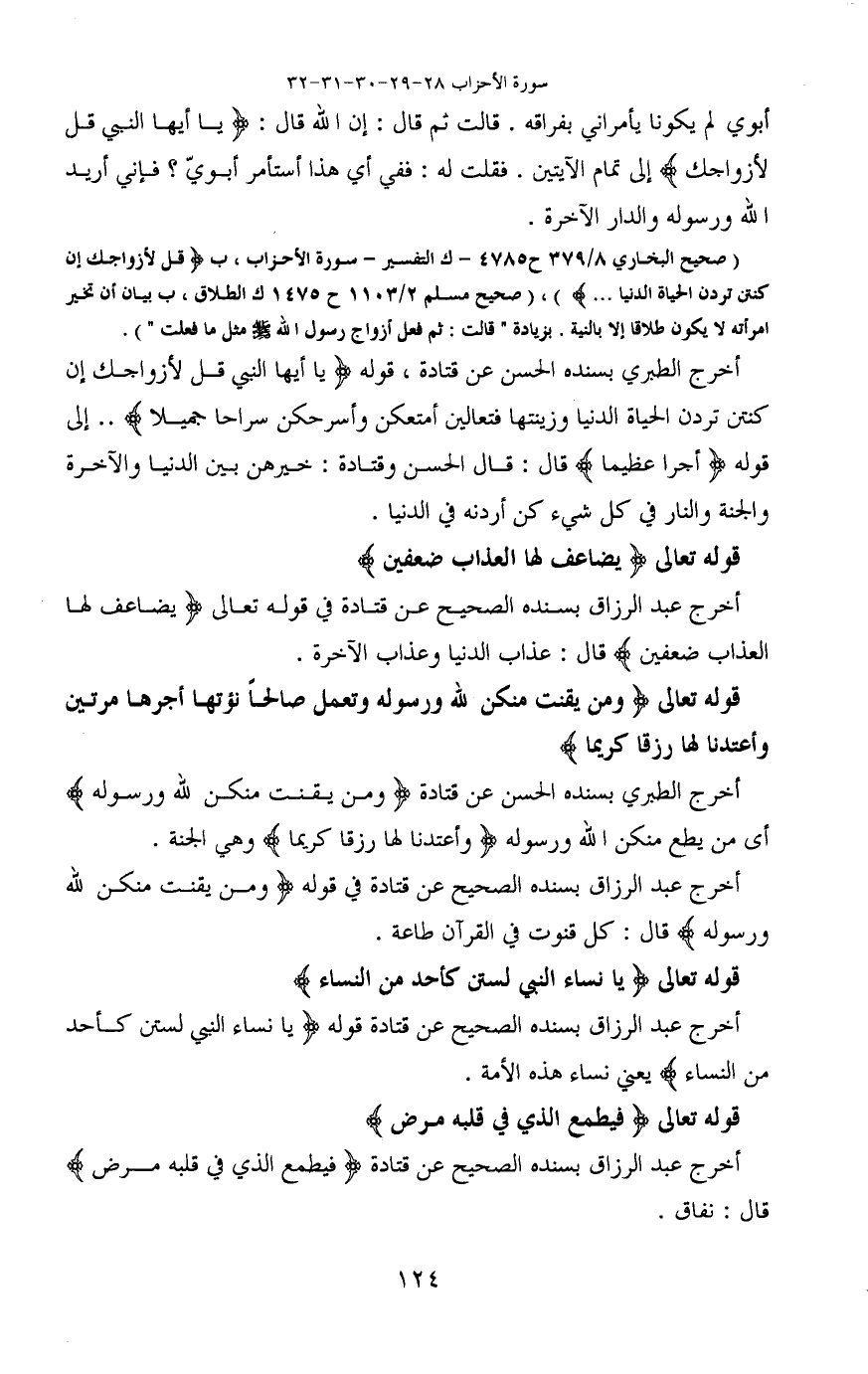 أخرج الطبري بسنده الحسن عن قتادة، قوله (يَا أَيُّهَا النَّبِيُّ قُلْ لِأَزْوَاجِكَ إِنْ كُنْتُنَّ تُرِدْنَ الْحَيَاةَ الدُّنْيَا وَزِينَتَهَا فَتَعَالَيْنَ أُمَتِّعْكُنَّ وَأُسَرِّحْكُنَّ سَرَاحًا جَمِيلًا) .. إلى قوله (أجرا عظيما) قال: قال الحسن وقتادة: خيرهن بين الدنيا والآخرة والجنة والنار في كل شيء كن أردنه في الدنيا.
