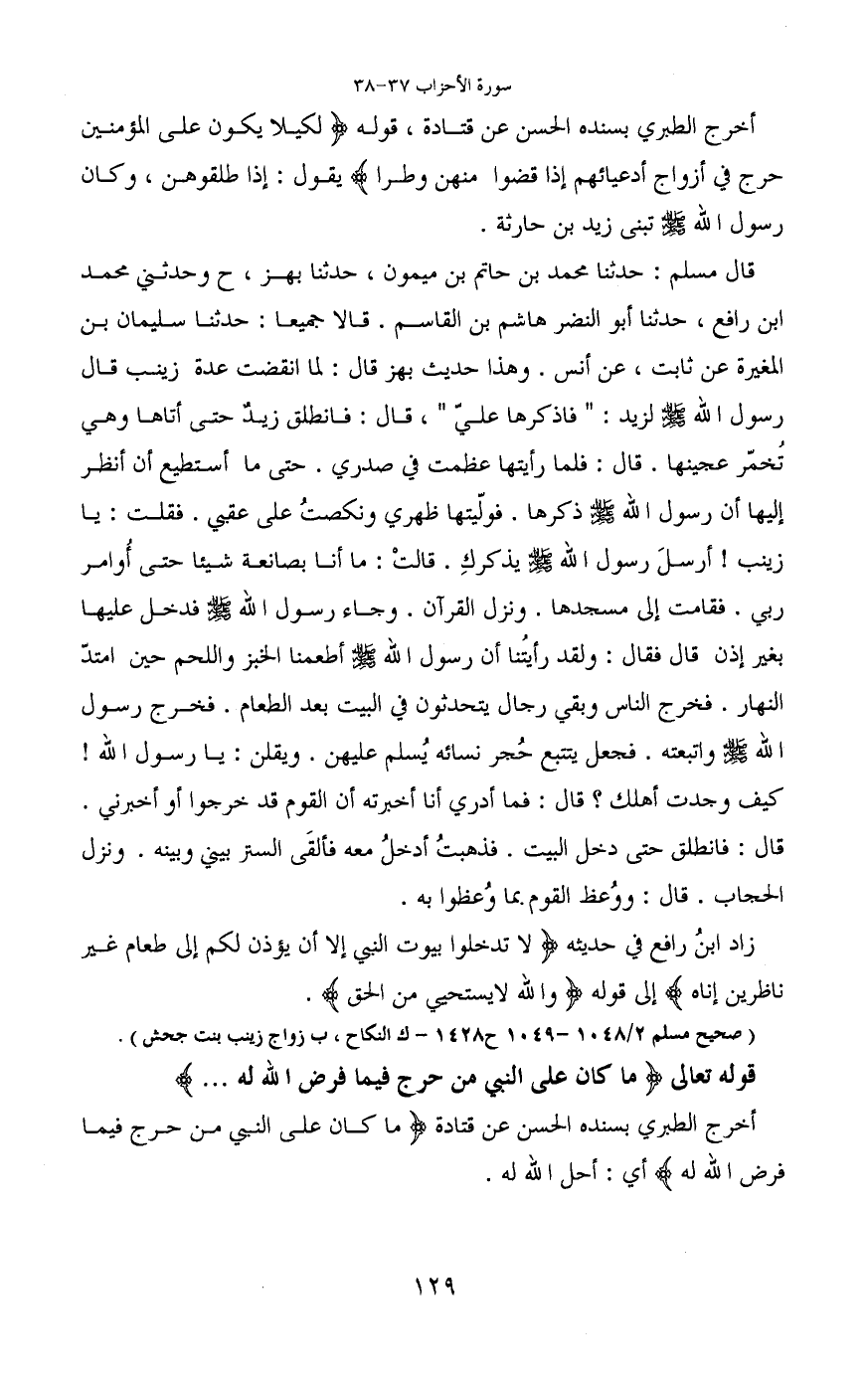 قال مسلم: حدثنا محمد بن حاتم بن ميمون، حدثنا بهز، ح وحدثتي محمد ابن رافع، حدثنا أبو النضر هاشم بن القاسم. قالا جميعا: حدثنا سليمان بن المغيرة عن ثابت، عن أنس. وهذا حديث بهز قال: لما انقضت عدة زينب قال رسول الله - صَلَّى اللَّهُ عَلَيْهِ وَسَلَّمَ - لزيد: "فاذكرها عليّ"، قال: فانطلق زيد حتى أتاها وهى تُخمّر عجينها. قال: فلما رأيتها عظمت في صدري. حتى ما أستطيع أن أنظر إليها أن رسول الله - صَلَّى اللَّهُ عَلَيْهِ وَسَلَّمَ - ذكرها. فولّيتها ظهري ونكصتُ على عقبي. فقلت: يا زينب! أرسلَ رسول الله - صَلَّى اللَّهُ عَلَيْهِ وَسَلَّمَ - يذكركِ. قالتْ: ما أنا بصانعة شيئا حتى أُوامر ربي. فقامت إلى مسجدها. ونزل القرآن. وجاء رسول الله - صَلَّى اللَّهُ عَلَيْهِ وَسَلَّمَ - فدخل عليها بغير إذن قال فقال: ولقد رأيتُنا أن رسول الله - صَلَّى اللَّهُ عَلَيْهِ وَسَلَّمَ - أطعمنا الخبز واللحم حين امتدّ
