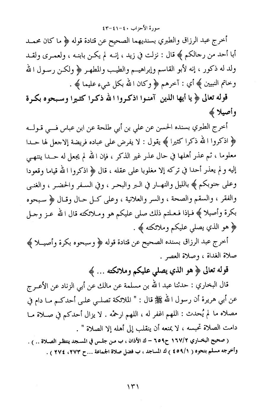 قوله تعالى (يَا أَيُّهَا الَّذِينَ آَمَنُوا اذْكُرُوا اللَّهَ ذِكْرًا كَثِيرًا (41) وَسَبِّحُوهُ بُكْرَةً وَأَصِيلًا)