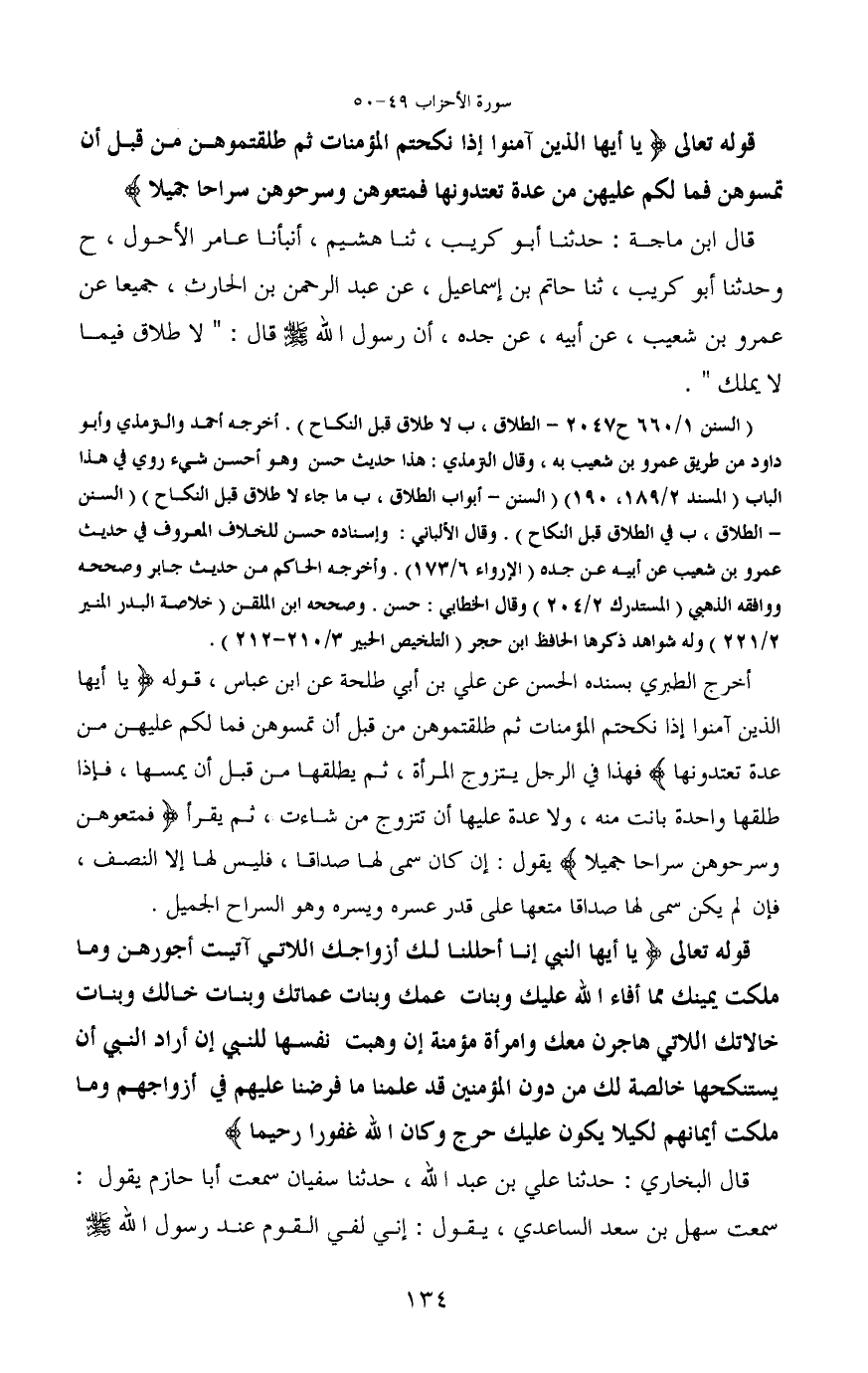 أخرج الطبري بسنده الحسن عن علي بن أبي طلحة عن ابن عباس، قوله (يا أيها الذين آمنوا إذا نكحتم المؤمنات ثم طلقتموهن من قبل أن تمسوهن فما لكم عليهن من عدة تعتدونها) فهذا الرجل يتزوج المرأة، ثم يطلقها من قبل أن يمسها، فإذا طلقها واحدة بانت منه، ولا عدة عليها أن تتزوج من شاءت، ثم يقرأ (فمتعوهن وسرحوهن سراحا جميلاً) يقول: إن كان سمى لها صداقا، فليس لها إلا النصف، إن لم يكن سمى لها صداقا متعها على قدر عسره ويسره وهو السراح الجميل.