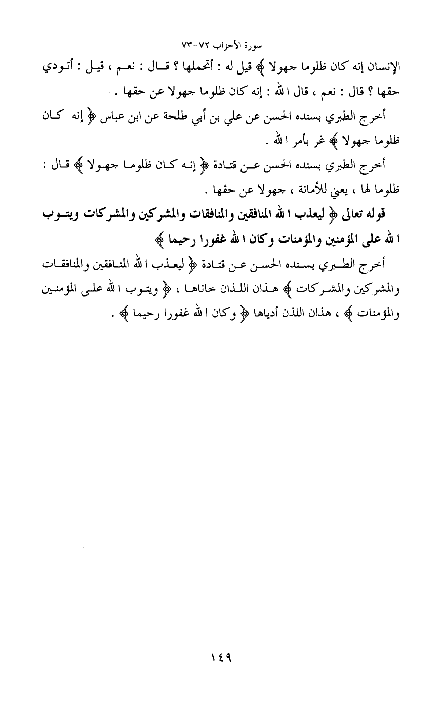 أخرج الطبري بسنده الحسن عن قتادة (ليعذب الله المنافقين والمنافقات والمشركين والمشركات) هذان اللذان خاناها، (ويتوب الله على المؤمنين والمؤمنات) ، هذان اللذان أدياها (وكان الله غفورا رحيما) .