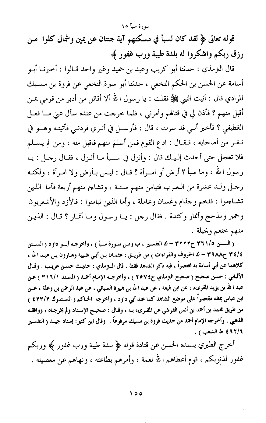 (السنن 5/361 ح3222 - ك التفسير، ب ومن سورة سبأ) ، وأخرجه أبو داود (السنن 4/34 ح3988 - ك الحروف والقراءات) من طريق: عثمان بن أبي شيبة وهارون بن عبد الله، كلاهما عن أبي أسامة به مختصراً، فيه ذكر الشاهد فقط. قال الترمذي: حديث حسن غريب. وقال الألباني: حسن صحيح (صحيح الترمذي ح2574) ، وأخرجه الإمام أحمد (المسند 1/316) من عبد الله بن يزيد المقرئ، عن ابن لهيعة، عن عبد الله بن هبيرة النسائي، عن عبد الرحمن بن وعلة، عن ابن عباس بمثله مقتصراً على موضع الشاهد كما عند أبي داود، وأخرجه الحاكم (المستدرك 2/423) من طريق محمد بن أحمد بن أنس القرشي عن المقرئ به، وقال: صحيح الإسناد ولم يخرجاه، ووافقه الذهبي. وأخرجه الإمام أحمد من حديث فروة بن مسيك مرفوعاً. وقال ابن كثير: إسناد جيد (التفسير 6/492 ط الشعب) .