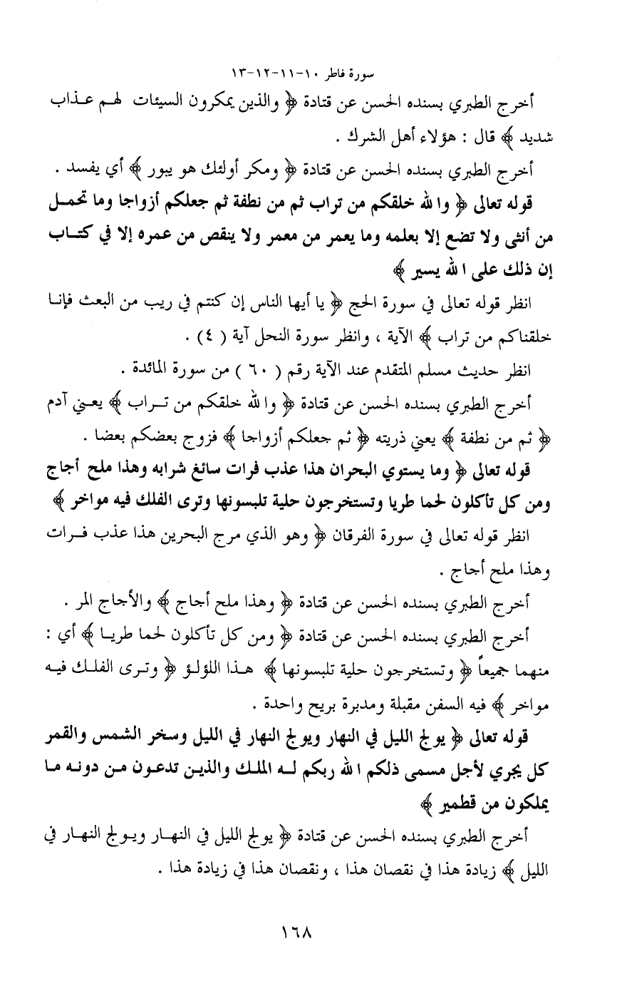 أخرج الطبري بسنده الحسن عن قتادة (ومن كل تأكلون لحما طريا) أي: منهما جميعاً (وتستخرجون حلية تلبسونها) هذا اللؤلؤ (وترى الفلك فيه مواخر) فيه السفن مقبلة مقبلة ومدبرة بريح واحدة.