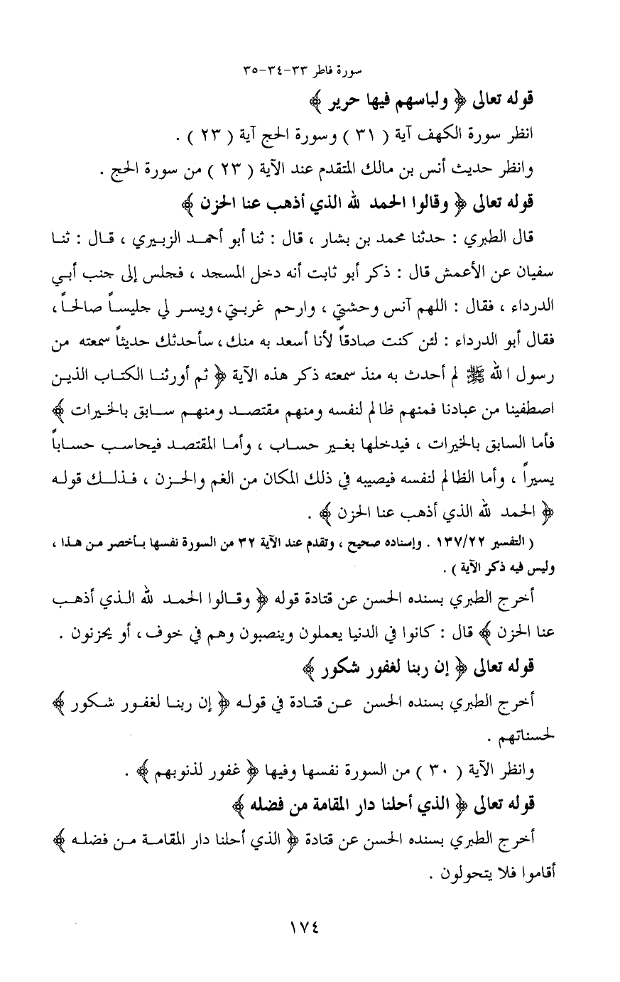قال الطبري: حدثنا محمد بن بشار، قال: ثنا أبو أحمد الزبيري، قال: ثنا سفيان عن الأعمش قال: ذكر أبو ثابت أنه دخل المسجد، فجلس إلى جنب أبي الدرداء، فقال: اللهم آنس وحشتي، وارحم غربتي، ويسر لي جليساً صالحاً، فقال أبو الدرداء: لئن كنت صادقاً لأنا أسعد به منك، سأحدثك حديثاً سمعته من رسول الله - صَلَّى اللَّهُ عَلَيْهِ وَسَلَّمَ - لم أحدث به منذ سمعته ذكر هذه الآية (ثم أورثنا الكتاب الذين اصطفينا من عبادنا فمنهم ظالم لنفسه ومنهم مقتصد ومنهم سابق بالخيرات) فأما السابق بالخيرات، فيدخلها بغير حساب، وأما المقتصد فيحاسب حساباً يسيراً، وأما الظالم لنفسه فيصيبه في ذلك المكان من الغم والحزن، فذلك قوله (الحمد لله الذي أذهب عنا الحزن) .