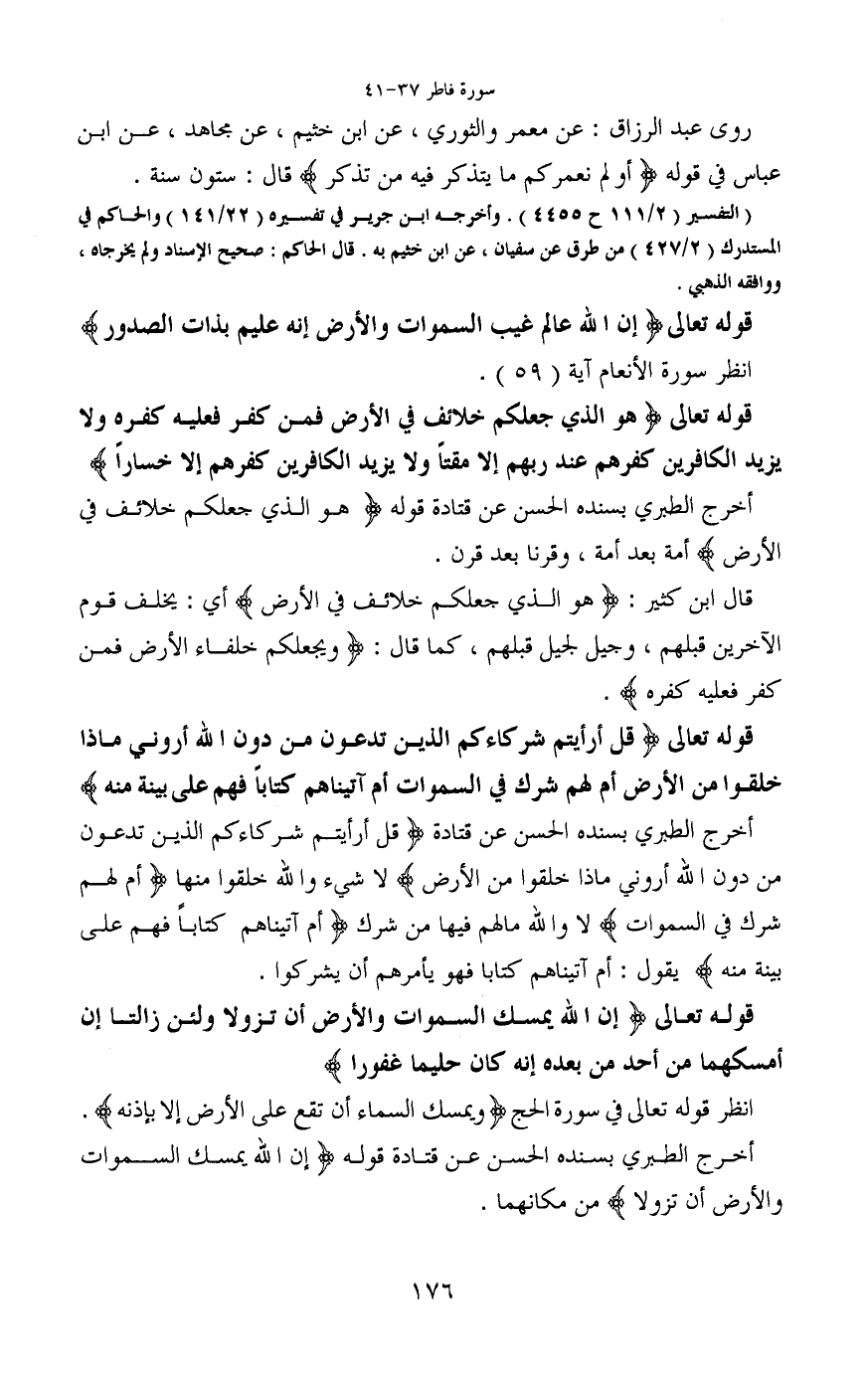 قوله تعالى (قُلْ أَرَأَيْتُمْ شُرَكَاءَكُمُ الَّذِينَ تَدْعُونَ مِنْ دُونِ اللَّهِ أَرُونِي مَاذَا خَلَقُوا مِنَ الْأَرْضِ أَمْ لَهُمْ شِرْكٌ فِي السَّمَاوَاتِ أَمْ آَتَيْنَاهُمْ كِتَابًا فَهُمْ عَلَى بَيِّنَةٍ منه) أخرج الطبري بسنده الحسن عن قتادة (قل أرأيتم شركاءكم الذين تدعون