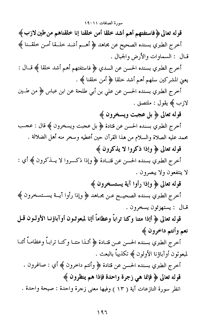 قوله تعالى (فَاسْتَفْتِهِمْ أَهُمْ أَشَدُّ خَلْقًا أَمْ مَنْ خَلَقْنَا إِنَّا خَلَقْنَاهُمْ مِنْ طِينٍ لَازِبٍ) أخرج الطبري بسنده الصحيح عن مجاهد (أهم أشد خلقا أمن خلقنا) قال: السماوات والأرض والجبال.