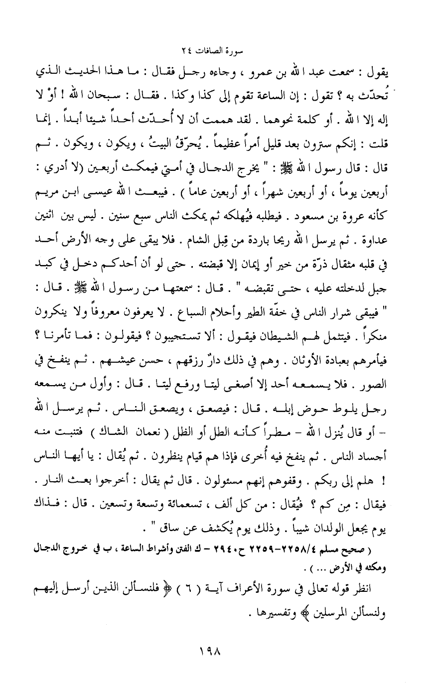 يقول: سمعت عبد الله بن عمرو، وجاءه رجل فقال، ما هذا الحديث الذي تُحدّث به؟ تقول: إن الساعة تقوم إلى كذا وكذا. فقال: سبحان الله! أوْ لا إله إلا الله. أو كلمة نحوهما. لقد هممت أن لا أحدّث أحداً شيئا أبداً. إنما قلت: إنكم سترون بعد قليل أمراً عظيماً. يُحرّقُ البيتُ، ويكون، ويكون. ثم قال: قال رسول الله - صَلَّى اللَّهُ عَلَيْهِ وَسَلَّمَ -: "يخرج الدجال في أمتي فيمكث أربعين (لا أدري: أربعين يوماً، أو أربعين شهراً، أو أربعين عاماً) . فيبعث الله عيسى ابن مريم كأنه عروة بن مسعود. فيطلبه فيُهلكه ثم يمكث الناس سبع سنين. ليس بين اثنين عداوة. ثم يرسل الله ريحا باردة من قِبل الشام. فلا يبقى على وجه الأرض أحد في قلبه مثقال ذرّة من خير أو إيمان إلا قبضته. حتى لو أن أحدكم دخل في كبد جبل لدخلته عليه، حتى تقبضه". قال: سمعتها من رسول الله - صَلَّى اللَّهُ عَلَيْهِ وَسَلَّمَ -. قال: "فيبقى شرار الناس في خفّة الطير وأحلام السباع. لا يعرفون معروفاً ولا ينكرون منكراً. فيتثمل الشيطان فيقول: ألا تستجيبون؟ فيقولون: فما تأمرنا؟