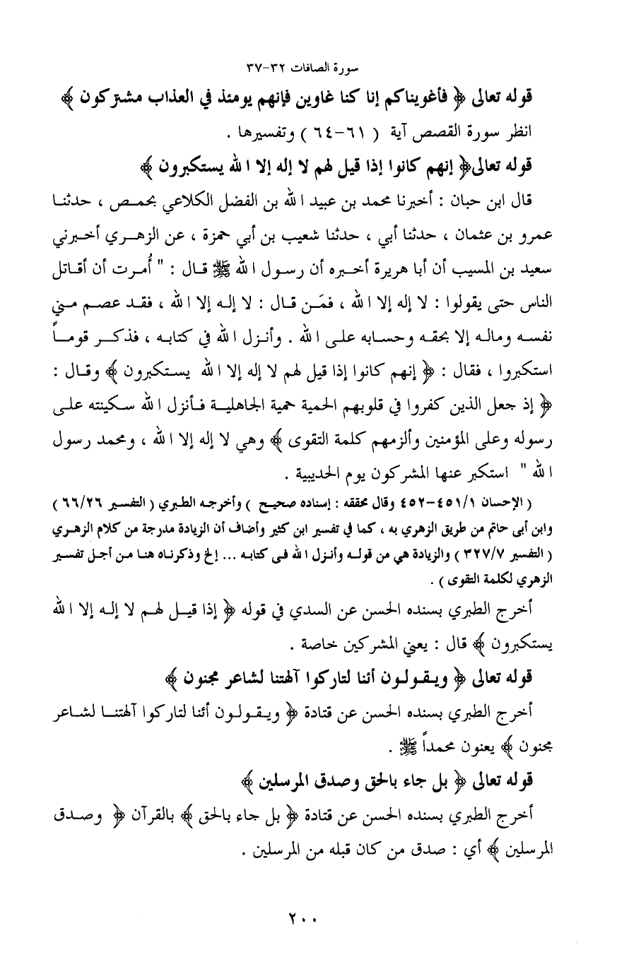 قال ابن حبان: أخبرنا محمد بن عبيد الله بن الفضل الكلاعي بحمص، حدثنا عمرو بن عثمان، حدثنا أبي، حدثنا شعيب بن أبي حمزة، عن الزهري أخبرني سعيد بن المسيب أن أبا هريرة أخبره أن رسول الله - صَلَّى اللَّهُ عَلَيْهِ وَسَلَّمَ - قال: "أمرت أن أقاتل الناس حتى يقولوا: لا إله إلا الله، فمَن قال: لا إله إلا الله، فقد عصم مني نفسه وماله إلا بحقه وحسابه على الله. وأنزل الله في كتابه، فذكر قوماً استكبروا، فقال: (إنهم كانوا إذا قيل لهم لا إله إلا الله يستكبرون) وقال: (إذ جعل الذين كفروا في قلوبهم الحمية حمية الجاهلية فأنزل الله سكينته على رسوله وعلى المؤمنين وألزمهم كلمة التقوى) وهي لا إله إلا الله، ومحمد رسول الله" استكبر عنها المشركون يوم الحديبية.