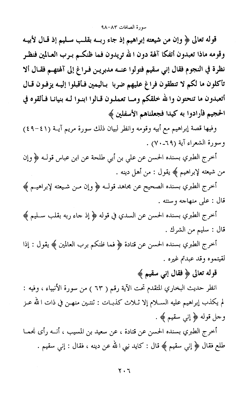 قوله تعالى (وَإِنَّ مِنْ شِيعَتِهِ لَإِبْرَاهِيمَ (83) إِذْ جَاءَ رَبَّهُ بِقَلْبٍ سَلِيمٍ (84) إِذْ قَالَ لِأَبِيهِ وَقَوْمِهِ مَاذَا تَعْبُدُونَ (85) أَئِفْكًا آَلِهَةً دُونَ اللَّهِ تُرِيدُونَ (86) فَمَا ظَنُّكُمْ بِرَبِّ الْعَالَمِينَ (87) فَنَظَرَ نَظْرَةً فِي النُّجُومِ (88) فَقَالَ إِنِّي سَقِيمٌ (89) فَتَوَلَّوْا عَنْهُ مُدْبِرِينَ (90) فَرَاغَ إِلَى آَلِهَتِهِمْ فَقَالَ أَلَا تَأْكُلُونَ (91) مَا لَكُمْ لَا تَنْطِقُونَ (92) فَرَاغَ عَلَيْهِمْ ضَرْبًا بِالْيَمِينِ (93) فَأَقْبَلُوا إِلَيْهِ يَزِفُّونَ (94) قَالَ أَتَعْبُدُونَ مَا تَنْحِتُونَ (95) وَاللَّهُ خَلَقَكُمْ وَمَا تَعْمَلُونَ (96) قَالُوا ابْنُوا لَهُ بُنْيَانًا فَأَلْقُوهُ فِي الْجَحِيمِ (97) فَأَرَادُوا بِهِ كَيْدًا فَجَعَلْنَاهُمُ الْأَسْفَلِينَ)