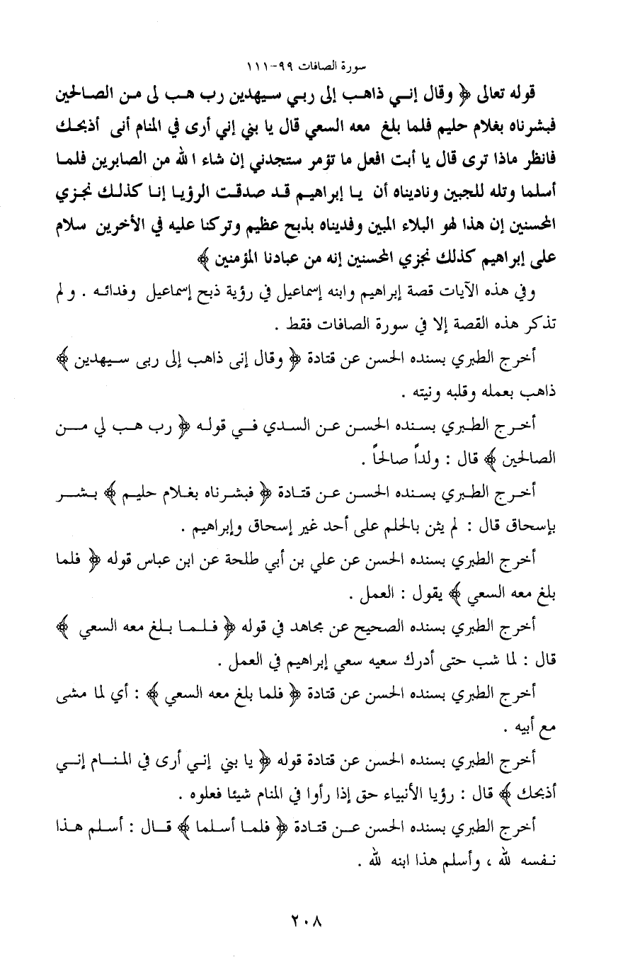 قوله تعالى (وَقَالَ إِنِّي ذَاهِبٌ إِلَى رَبِّي سَيَهْدِينِ (99) رَبِّ هَبْ لِي مِنَ الصَّالِحِينَ (100) فَبَشَّرْنَاهُ بِغُلَامٍ حَلِيمٍ (101) فَلَمَّا بَلَغَ مَعَهُ السَّعْيَ قَالَ يَا بُنَيَّ إِنِّي أَرَى فِي الْمَنَامِ أَنِّي أَذْبَحُكَ فَانْظُرْ مَاذَا تَرَى قَالَ يَا أَبَتِ افْعَلْ مَا تُؤْمَرُ سَتَجِدُنِي إِنْ شَاءَ اللَّهُ مِنَ الصَّابِرِينَ (102) فَلَمَّا أَسْلَمَا وَتَلَّهُ لِلْجَبِينِ (103) وَنَادَيْنَاهُ أَنْ يَا إِبْرَاهِيمُ (104) قَدْ صَدَّقْتَ الرُّؤْيَا إِنَّا كَذَلِكَ نَجْزِي الْمُحْسِنِينَ (105) إِنَّ هَذَا لَهُوَ الْبَلَاءُ الْمُبِينُ (106) وَفَدَيْنَاهُ بِذِبْحٍ عَظِيمٍ (107) وَتَرَكْنَا عَلَيْهِ فِي الْآَخِرِينَ (108) سَلَامٌ عَلَى إِبْرَاهِيمَ (109) كَذَلِكَ نَجْزِي الْمُحْسِنِينَ (110) إِنَّهُ مِنْ عِبَادِنَا الْمُؤْمِنِينَ)