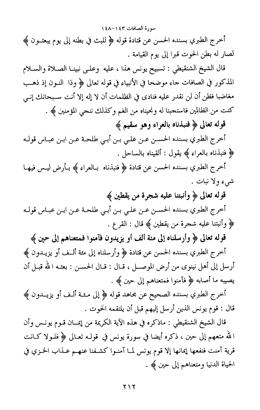 قوله تعالى (وَأَرْسَلْنَاهُ إِلَى مِئَةِ أَلْفٍ أَوْ يَزِيدُونَ (147) فَآَمَنُوا فَمَتَّعْنَاهُمْ إِلَى حِينٍ) أخرج الطبري بسنده الحسن عن قتادة (وَأَرْسَلْنَاهُ إِلَى مِئَةِ أَلْفٍ أَوْ يَزِيدُونَ) أرسل إلى أهل نينوى من أرض الموصل، قال: قال الحسن: بعثه الله قبل أن يصيبه ما أصابه (فَآَمَنُوا فَمَتَّعْنَاهُمْ إِلَى حِينٍ) .