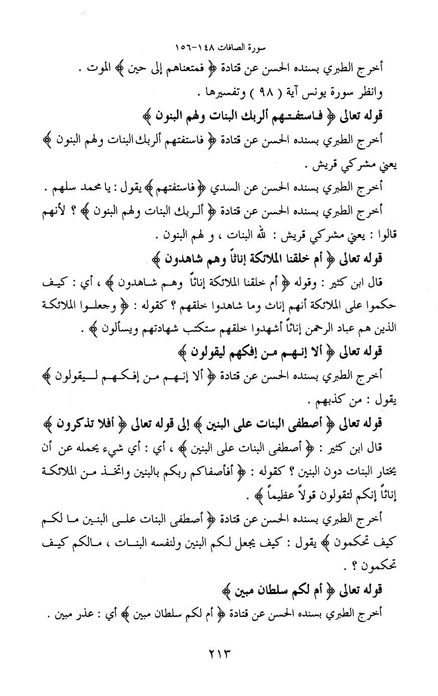 أخرج الطبري بسنده الحسن عن قتادة (أَصْطَفَى الْبَنَاتِ عَلَى الْبَنِينَ (153) مَا لَكُمْ كَيْفَ تَحْكُمُونَ) يقول: كيف يجعل لكم البنين ولنفسه البنات، ما لكم كيف تحكون؟.
