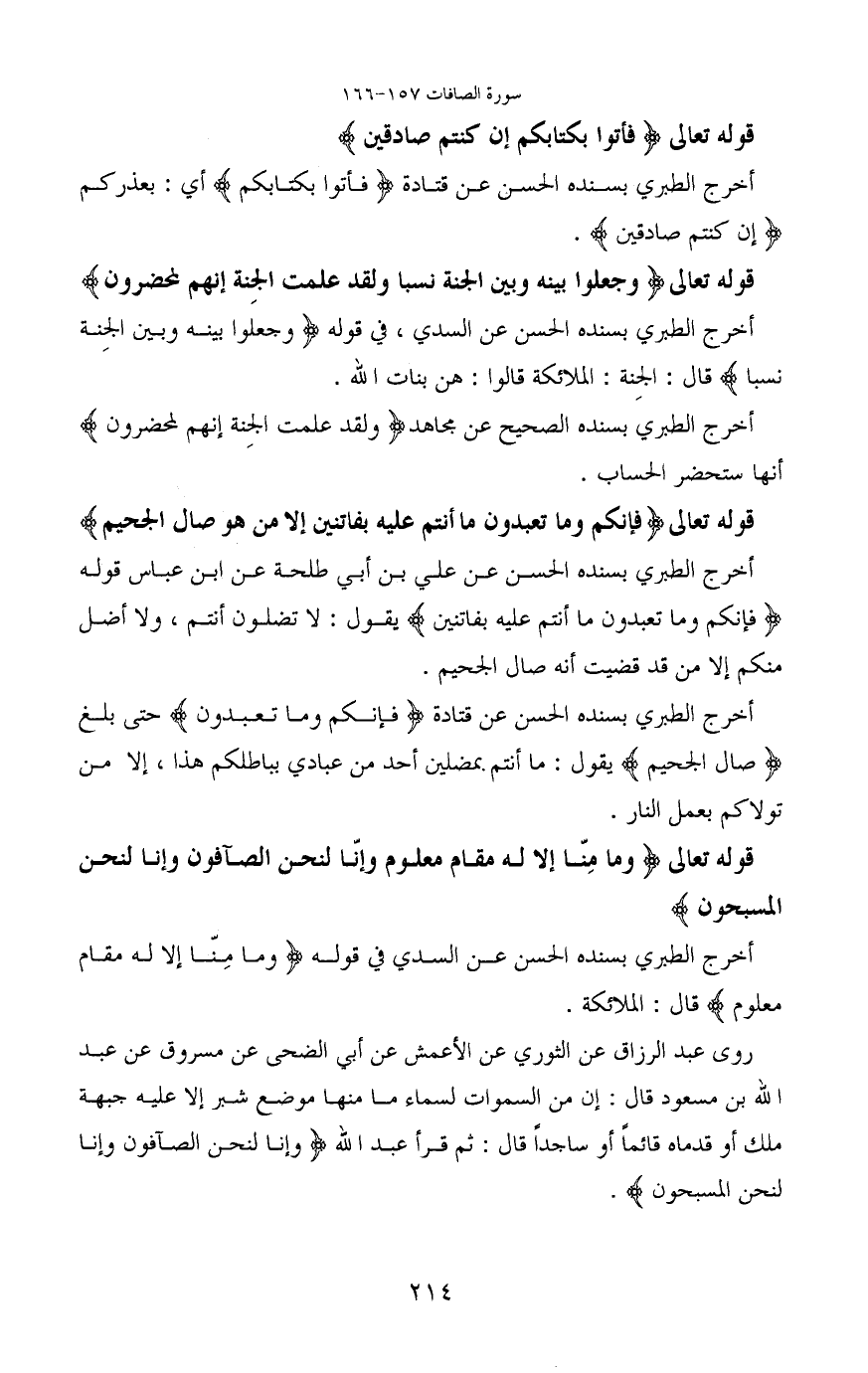 قوله تعالى (وَجَعَلُوا بَيْنَهُ وَبَيْنَ الْجِنَّةِ نَسَبًا وَلَقَدْ عَلِمَتِ الْجِنَّةُ إِنَّهُمْ لَمُحْضَرُونَ) أخرج الطبري بسنده الحسن عن السدي، في قوله (وَجَعَلُوا بَيْنَهُ وَبَيْنَ الْجِنَّةِ نَسَبًا) قال: الجِنة: الملائكة قالوا: هن بنات الله.