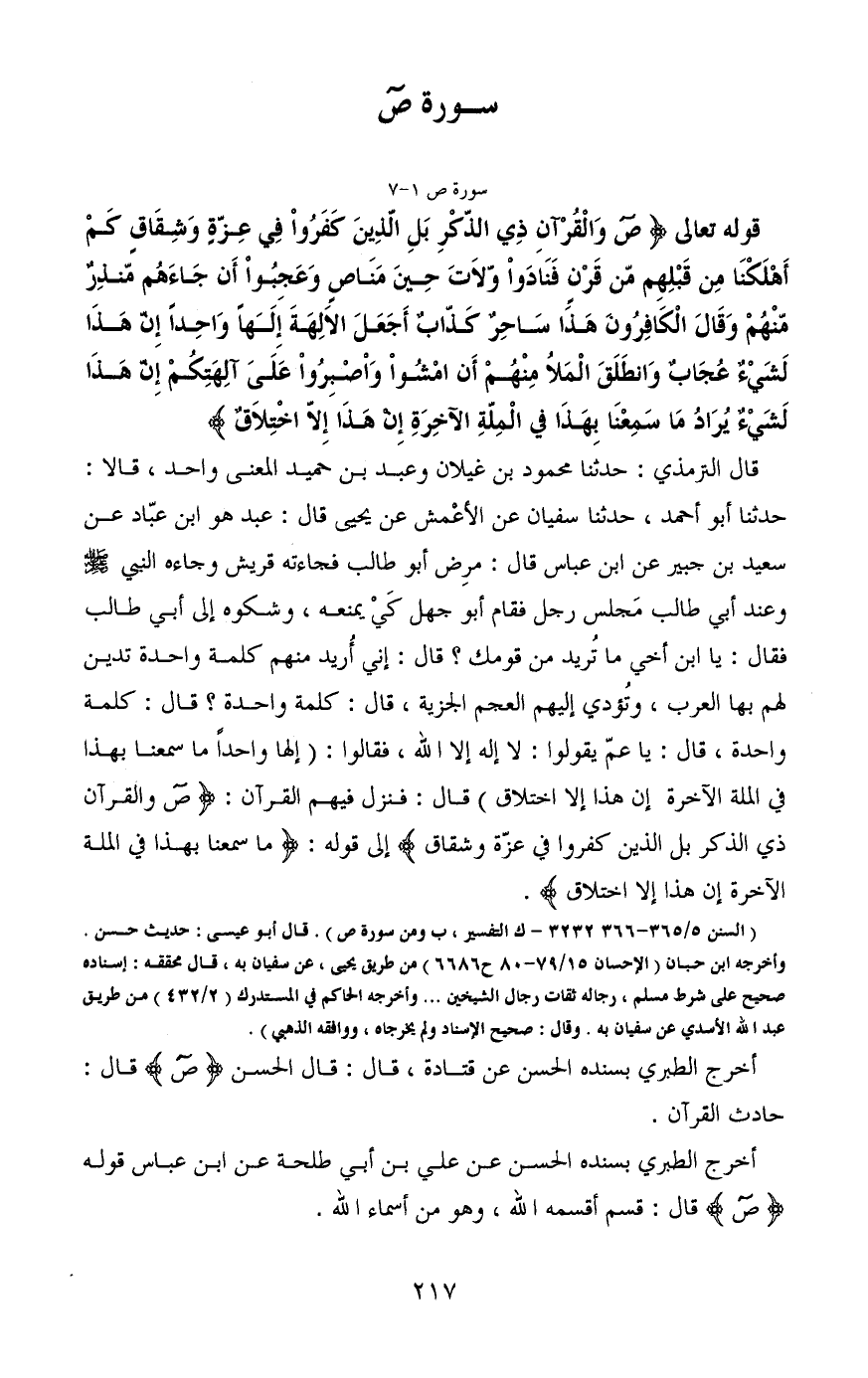 قال الترمذي: حدثنا محمود بن غيلان وعبد بن حميد المعنى واحد، قالا: حدثنا أبو أحمد، حدثنا سفيان عن الأعمش عن يحيى قال: عبد هو ابن عبّاد عن سعيد بن جبير عن ابن عباس قال: مرِض أبو طالب فجاءته قريش وجاءه النبي - صَلَّى اللَّهُ عَلَيْهِ وَسَلَّمَ - وعند أبي طالب مَجلس رجل فقام أبو جهل كَيْ يمنعه، وشكوه إلى أبي طالب فقال: يا ابن أخي ما تُريد من قومك؟ قال: إني أُريد منهم كلمة واحدة تدين لهم بها العرب، وتُؤدي إليهم العجم الجزية، قال: كلمة واحدة؟ قال؟ كلمة واحدة، قال: يا عمّ يقولوا: لا إله إلا الله، فقالوا: (إلها واحداً ما سمعنا بهذا في الملة الآخرة إن هذا إلا اختلاق) قال: فنزل فيهم القرآن: (ص وَالْقُرْآنِ ذِي الذِّكْرِ (1)