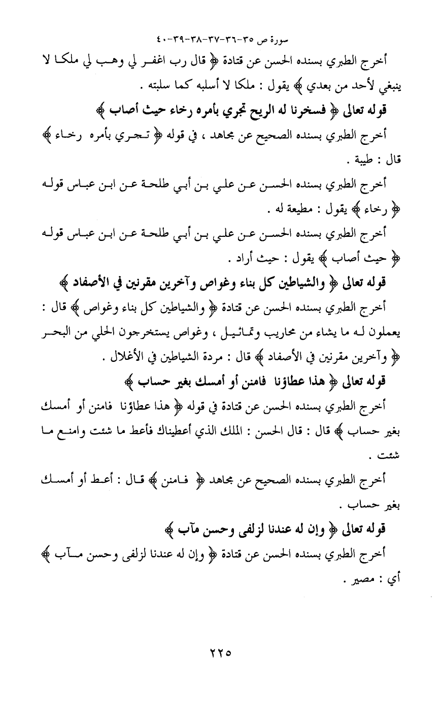 قوله تعالى (وَالشَّيَاطِينَ كُلَّ بَنَّاءٍ وَغَوَّاصٍ (37) وَآَخَرِينَ مُقَرَّنِينَ فِي الْأَصْفَادِ) أخرج الطبري بسنده الحسن عن قتادة (والشياطين كل بناء وغواص) قال: يعملون له ما يشاء من محاريب وتماثيل، وغواص يستخرجون الحلي من البحر (وآخرين مقرنين في الأصفاد) قال: مردة الشياطين في الأغلال.