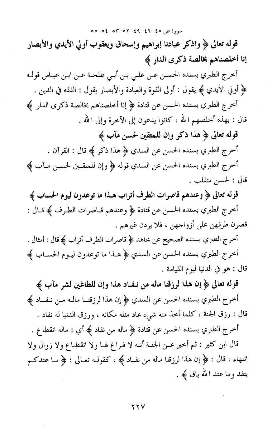 قوله تعالى (وَعِنْدَهُمْ قَاصِرَاتُ الطَّرْفِ أَتْرَابٌ (52) هَذَا مَا تُوعَدُونَ لِيَوْمِ الْحِسَابِ) أخرج الطبري بسنده الحسن عن قتادة (وعندهم قاصرات الطرف) قال: قصرن طرفهن على أزواجهن، فلا يردن غيرهم.