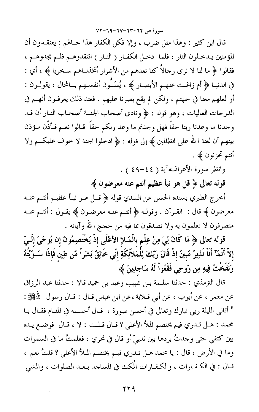 قال الترمذي: حدثنا سلمة بن شبيب وعبد بن حميد قالا: حدثنا عبد الرزاق عن معمر، عن أيوب، عن أبي قلابة، عن ابن عباس قال: قال رسول الله - صَلَّى اللَّهُ عَلَيْهِ وَسَلَّمَ -: "أتاني الليلة ربي تبارك وتعالى في أحسن صورة، قال أحسبه في المنام فقال يا محمد: هل تدري فيم يختصم الملأ الأعلى؟ قال قلت: لا، قال فوضع يده بين كتفي حتى وجدتُ بردها بين ثدييّ أو قال في نحري، فعلمتُ ما في السماوات وما في الأرض، قال: يا محمد هل تدري فيم يختصم الملأ الأعلى؟ قلتُ نعم، قال: في الكفارات، والكفارات المكث في المساجد بعد الصلوات، والمشي